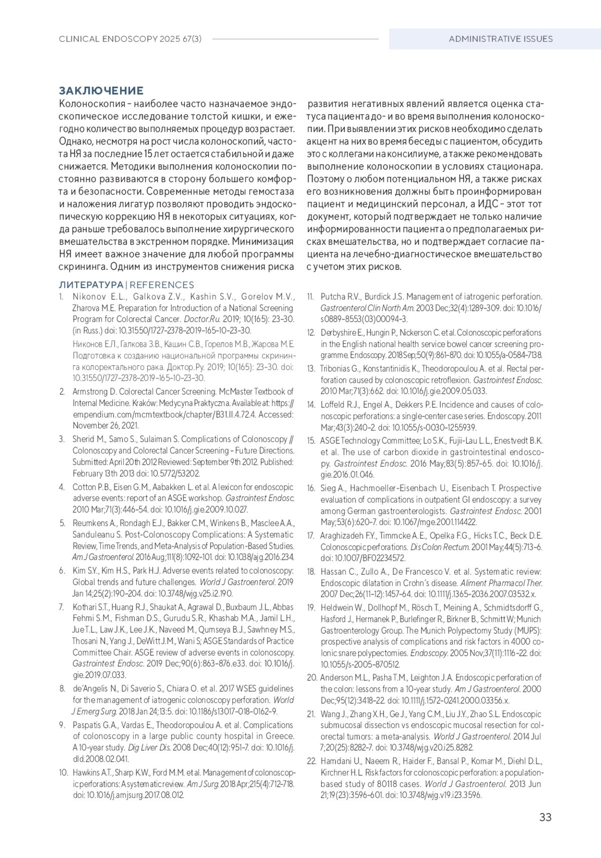 6. Kim S.Y., Kim H.S., Park H.J. Adverse events related to colonoscopy: Global trends and future challenges. World J Gastroenterol. 2019 Jan 14;25(2):190-204. DOI: 10.3748/wjg.v25.i2.190