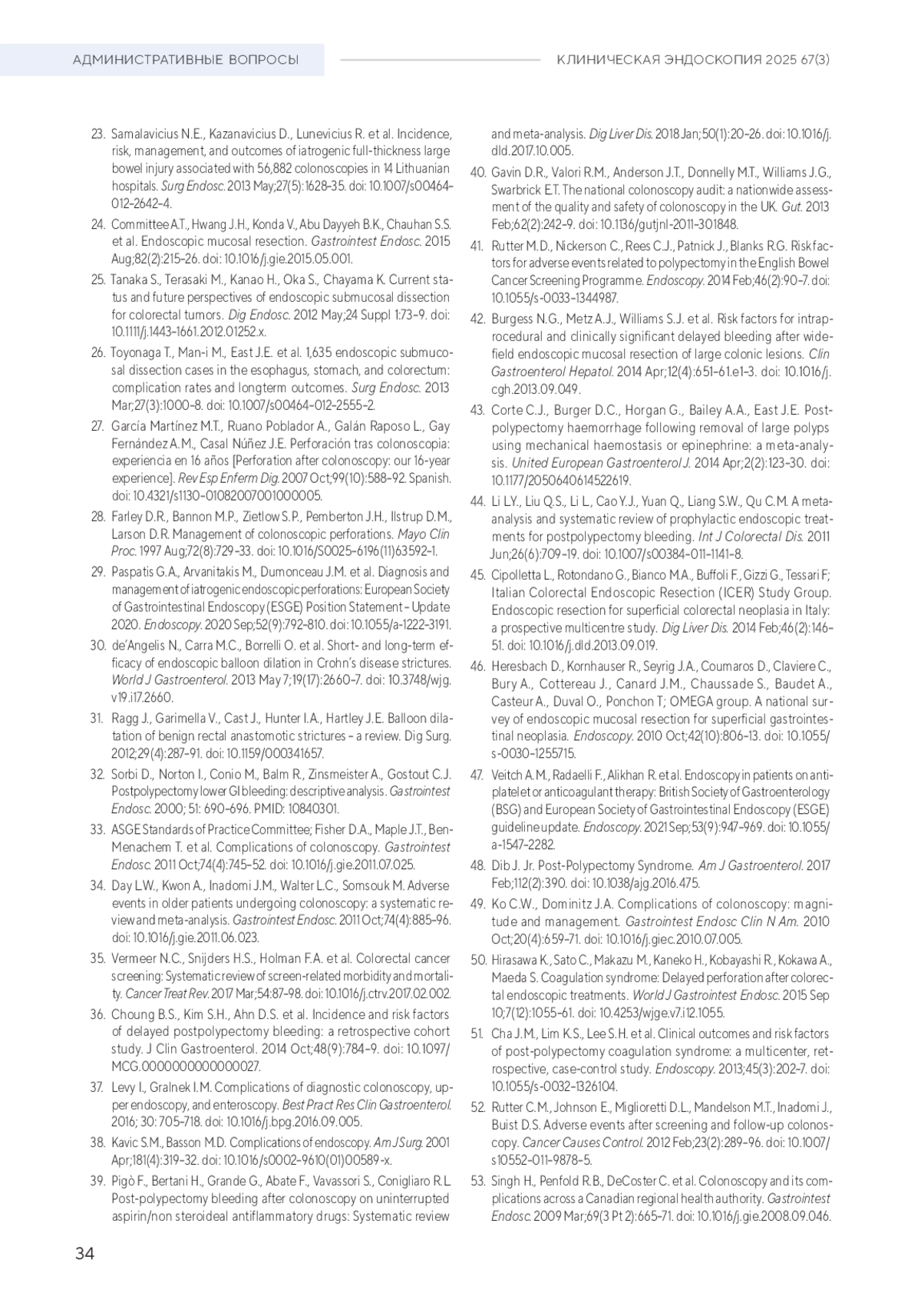 36. Choung B.S., Kim S.H., Ahn D.S. et al. Incidence and risk factors of delayed postpolypectomy bleeding: a retrospective cohort study. J Clin Gastroenterol. 2014 Oct;48(9):784-9. DOI: 10.1097/MCG.0000000000000027