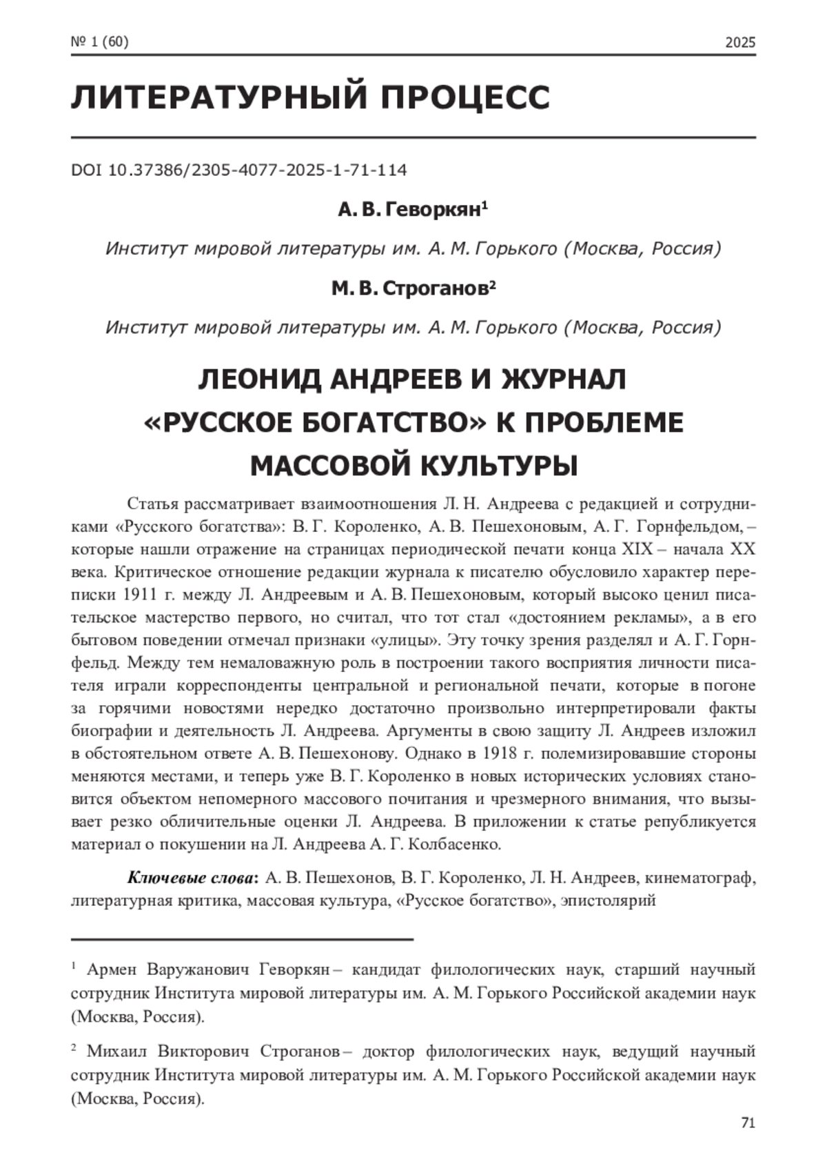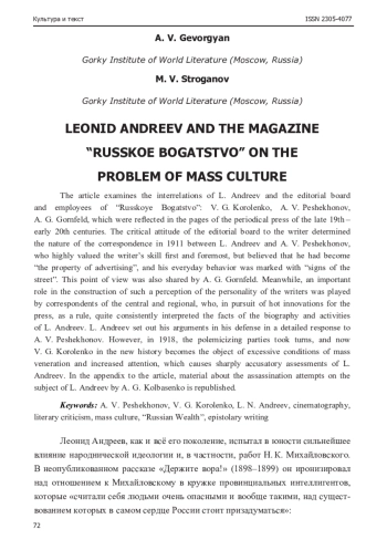 Статья рассматривает взаимоотношения Л. Н. Андреева с редакцией и сотрудниками «Русского богатства»: В. Г. Короленко, А. В. Пешехоновым, А. Г. Горнфельдом, - которые нашли отражение на страницах периодической печати конца XIX - начала XX века. Критическое отношение редакции журнала к писателю обусловило характер переписки 1911 г. между Л. Андреевым и А. В. Пешехоновым, который высоко ценил писательское мастерство первого, но считал, что тот стал «достоянием рекламы», а в его бытовом поведении отмечал признаки «улицы». Эту точку зрения разделял и А. Г. Горнфельд. Между тем немаловажную роль в построении такого восприятия личности писателя играли корреспонденты центральной и региональной печати, которые в погоне за горячими новостями нередко достаточно произвольно интерпретировали факты биографии и деятельность Л. Андреева. Аргументы в свою защиту Л. Андреев изложил в обстоятельном ответе А. В. Пешехонову. Однако в 1918 г. полемизировавшие стороны меняются местами, и теперь уже В. Г. Короленко в новых исторических условиях становится объектом непомерного массового почитания и чрезмерного внимания, что вызывает резко обличительные оценки Л. Андреева. В приложении к статье републикуется материал о покушении на Л. Андреева А. Г. Колбасенко.