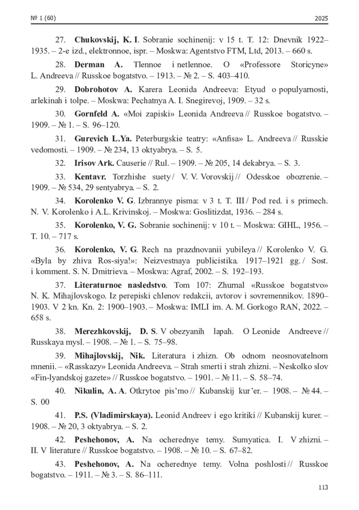 25. Дерман, А. Тленное и нетленное. О “Профессоре Сторицыне” Л. Андреева / А. Дерман // Русское богатство. - 1913. - № 2. - С. 403-410.