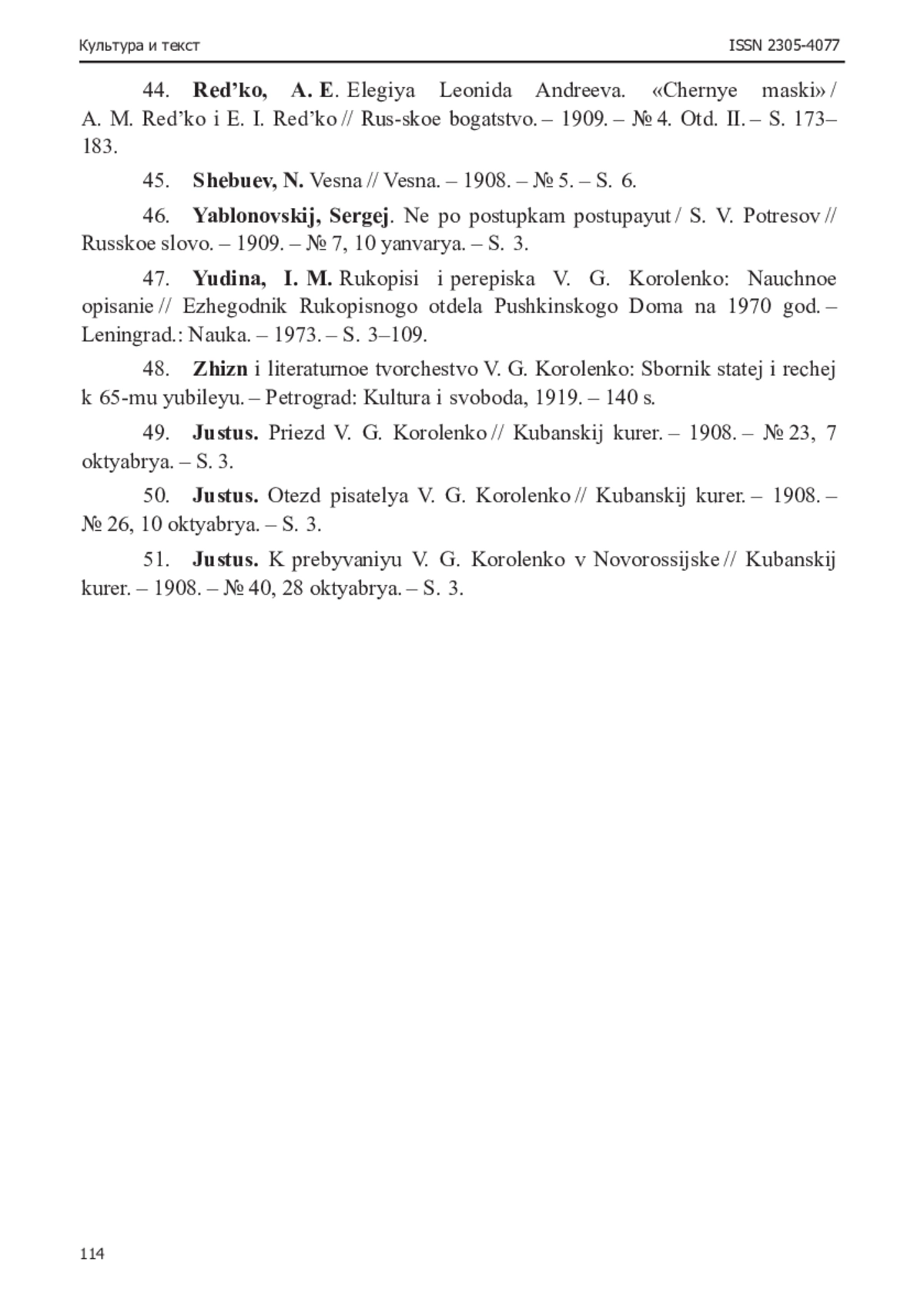 51. Justus. К пребыванию В. Г. Короленко в Новороссийске // Кубанский курьер. - 1908. - № 40, 28 октября. - С. 3.