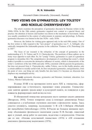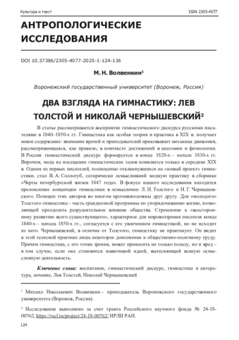 В статье рассматривается восприятие гимнастического дискурса русскими писателями в 1840-1850-х гг. Гимнастика как особая теория и практика в XIX в. получает новое содержание: внимание врачей и преподавателей приковывает механика движения, рассматривающаяся, как правило, в контексте достижений в анатомии и физиологии. В России гимнастический дискурс формируется в конце 1820-х - начале 1830-х гг. Впрочем, мода на посещение гимнастических залов появляется только в середине XIX в. Одним из первых писателей, полноценно откликнувшихся на «новый проект» гимнастики, стал В. А. Соллогуб, сатирически осмысливший модную практику в сборнике «Черты петербургской жизни 1847 года». В фокусе нашего исследования находится преломление концепции гимнастики в осмыслении Л. Н. Толстого и Н. Г. Чернышевского. Позиции этих авторов во многом противоположны друг другу. Для «молодого» Толстого гимнастика - часть грандиозной программы по упорядочиванию жизни, позволяющей преодолеть разрушительное влияние общества. Стремление к «всестороннему развитию всего существующего», характерное для мировоззрения писателя конца 1840-х - начала 1850-х гг., согласуется с его увлечением гимнастикой, но не исходит из него. Чернышевский, в отличие от Толстого, гимнастику не практикует. Он видит в этой телесной практике лишь некоторое дополнение к общественно-полезному труду. Причем гимнастика, с его точки зрения, может приносить не только пользу, но и вред - в том случае, если она становится навязчивой идеей, вытесняющей всякую осмысленную деятельность.