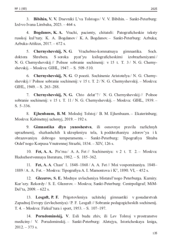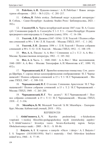 1. Абдульманова, Л. В. Развитие представлений о физическом воспитании в русской философско-педагогической мысли (исторический аспект) / Л. В. Абдульманова // Известия вузов. Северо-Кавказский регион. Серия: Общественные науки. - 2005. - № 11. - С. 80-86.