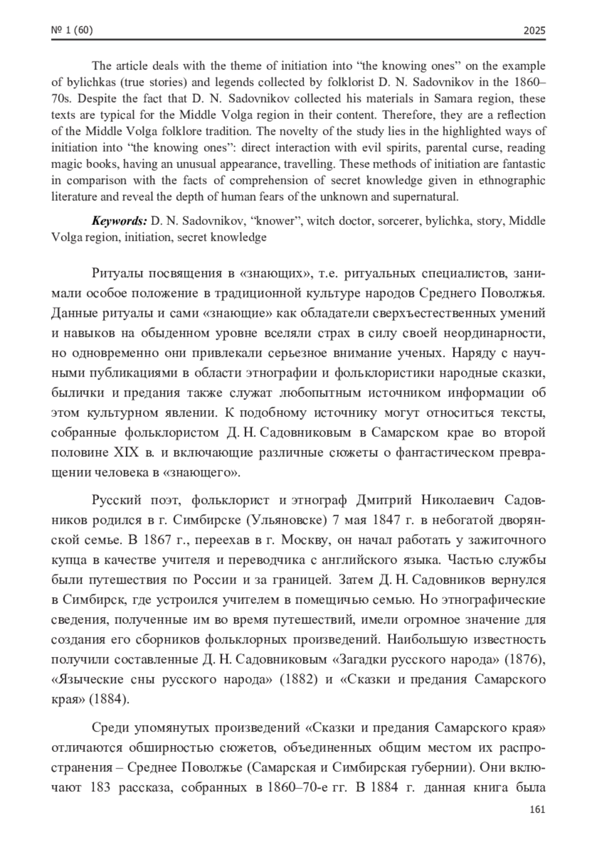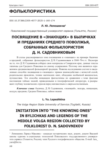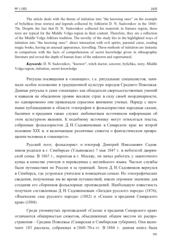 В статье рассматривается тема посвящения в «знающих» на примере быличек и преданий, собранных фольклористом Д. Н. Садовниковым в 1860-70-е гг. Несмотря на то, что Д. Н. Садовников собирал свои материалы в Самарском крае, данные тексты типичны для Среднего Поволжья по своему содержанию. Поэтому они являются отражением средневолжской фольклорной традиции. Новизна исследования состоит в выделенных способах посвящения в «знающих»: прямое взаимодействие с нечистой силой, родительское проклятие, чтение магических книг, обладание необычной внешностью, путешествия. Эти способы инициации фантастичны по сравнению с теми фактами постижения тайных знаний, приведенными в этнографической литературе, и раскрывают глубину человеческих страхов перед неизвестным и сверхъестественным.