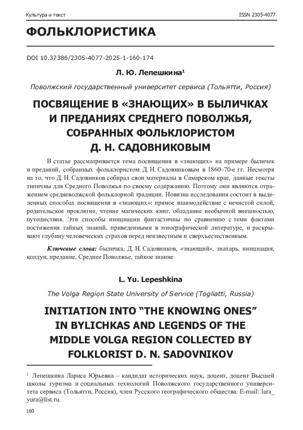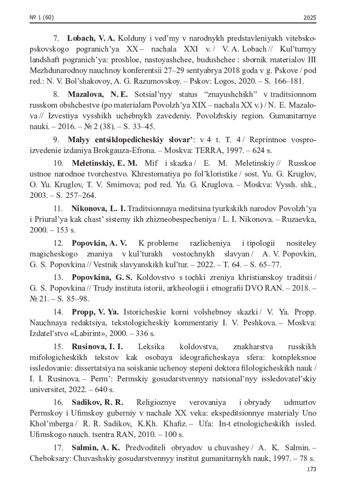 8. Мазалова, Н. Е. Социальный статус “знающих” в традиционном русском обществе (по материалам Поволжья ХIХ - начала ХХ в.) / Н. Е. Мазалова // Известия высших учебных заведений. Поволжский регион. Гуманитарные науки. - 2016. - № 2 (38). - С. 33-45. EDN: WKXOMD