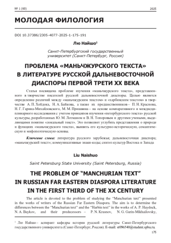 Статья посвящена проблеме изучения «маньчжурского текста», представленного в творчестве писателей русской дальневосточной диаспоры. Целью является определение различий между «маньчжурским текстом» и «харбинским текстом» в творчестве А. П. Хейдока, Н. А. Байкова, а также их предшественников - П. Н. Краснова, Н. Г. Гарина-Михайловского, М. М. Пришвина - на основе компаративного и междисциплинарного исследования с учетом принципов изучения «петербургского текста» русской культуры, разработанных Ю. М. Лотманом и В. Н. Топоровым и другими учеными, выделяющими понятие «локальный текст». Это позволяет углубить представления о природе и функциях «маньчжурского текста», выявить его культурно-историческую, семантическую и мифопоэтическую основы.