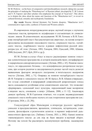 В современном литературоведении возрос научный интерес к изучению локальных текстов, принципов их кодификации и составляющих их символических знаков. В семиотических исследованиях Ю. М. Лотмана и В. Н. Топорова «петербургский текст» был рассмотрен как сверхтекст, на основе которого продолжены исследования «московского текста», «пермского текста», «алтайского текста», «харбинского текста» в рамках мифопоэтики русской литературы (см. об этом: [Лотман, 1992; Топоров, 2003; Одесский, 1998; Абашев, 2000; Богумил, 2017; Цуй, 2018 и др.]).
