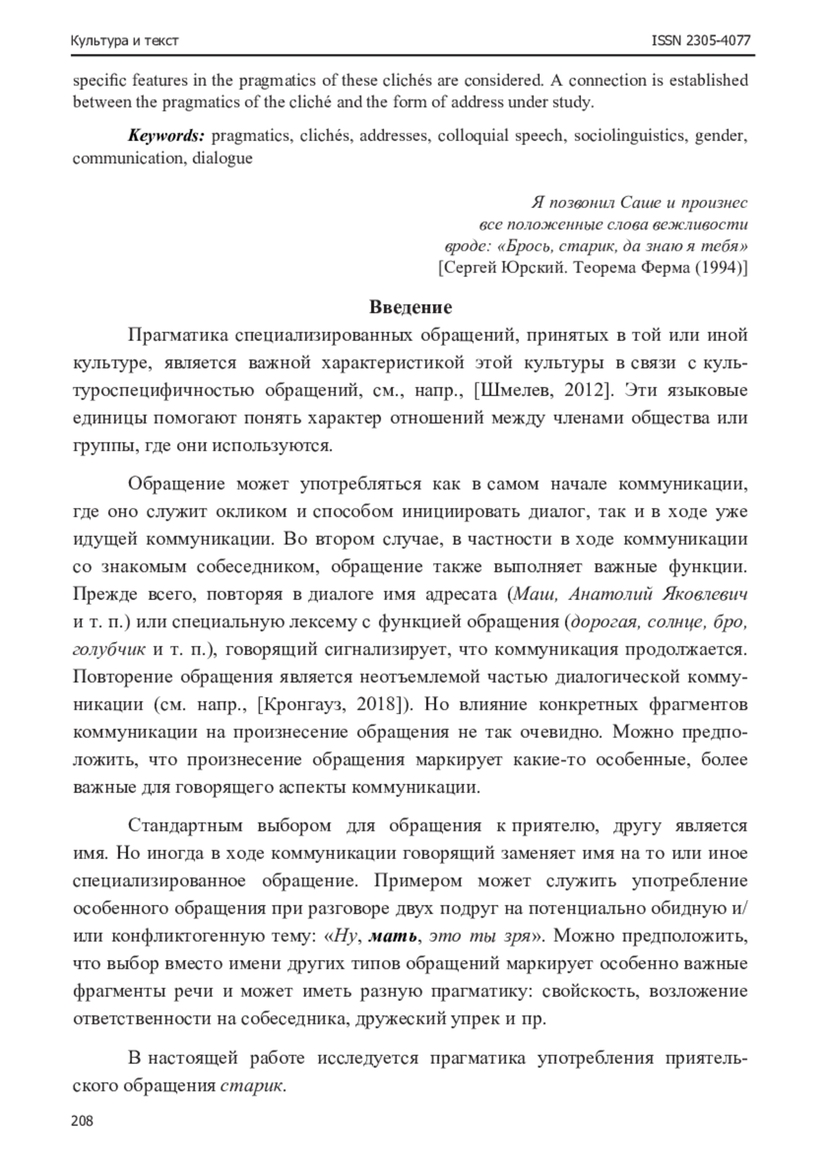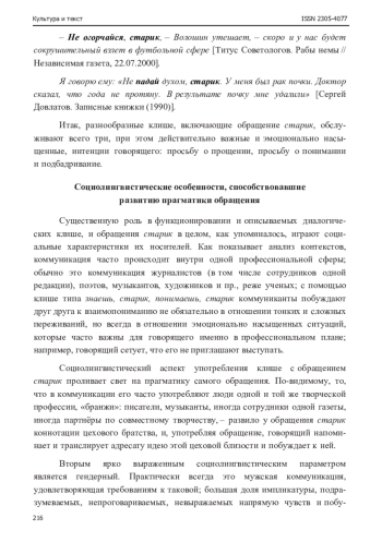 Прагматика мужского приятельского обращения старик (без семантики возраста) выявляется в исследовании на материале диалогических клише, содержащих обращение и глагол в императиве или форме 2 лица настоящего времени, таких как «Понимаешь, старик…», где глагол может выступать и как самостоятельное клише. Как показал анализ контекстов с обращением старик в основном и газетном подкорпусах Национального корпуса русского языка, не менее пятой части контекстов содержат это обращение в составе клише, набор которых не превышает двух десятков единиц, то есть употребление обращения достаточно стандартизовано. Клише употребляются в трех коммуникативных ситуациях: просьбе о прощении, просьбе о понимании и подбадривании. Рассматривается общее и особенности в прагматике данных клише. Устанавливается связь прагматики клише и исследуемого обращения.