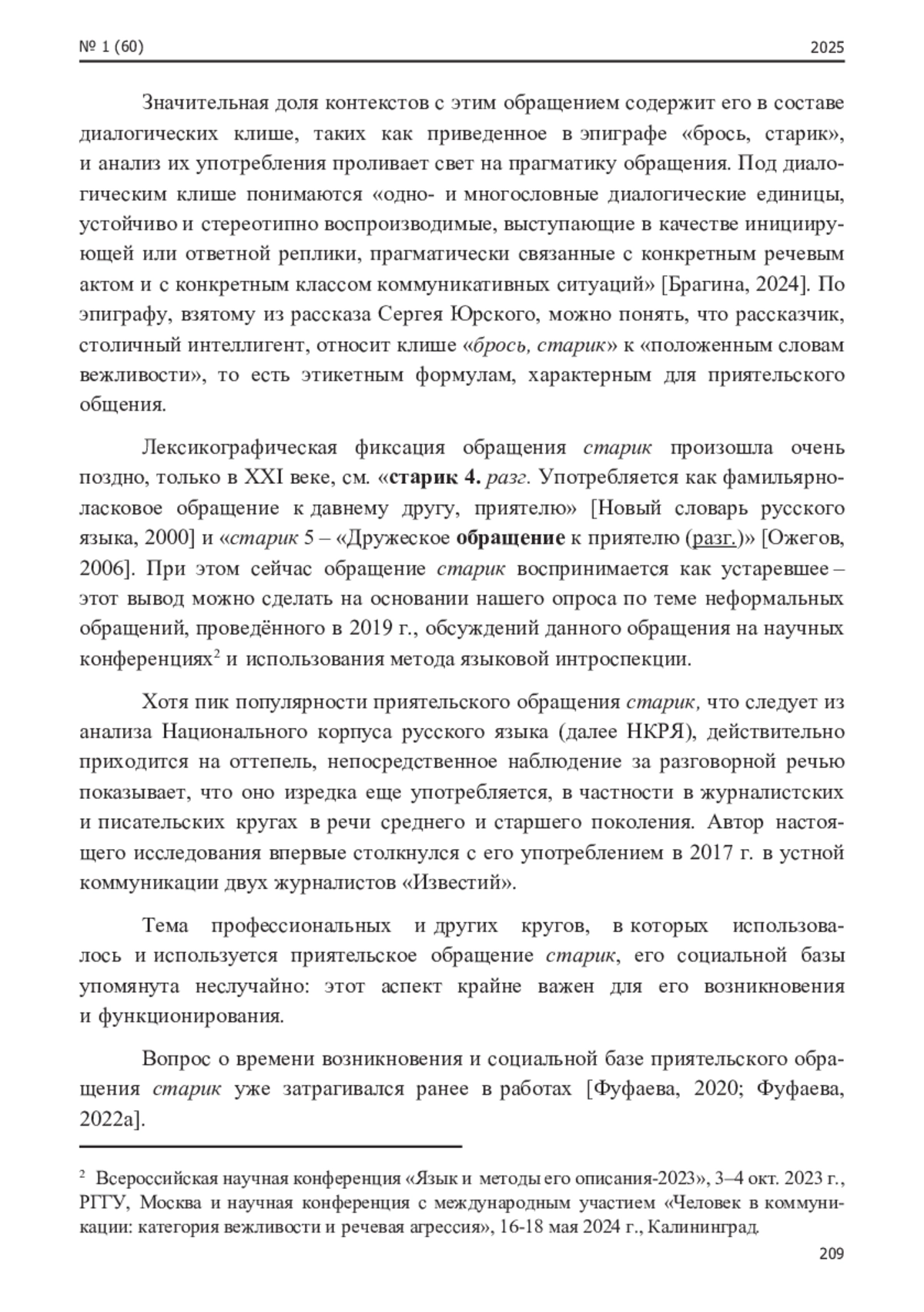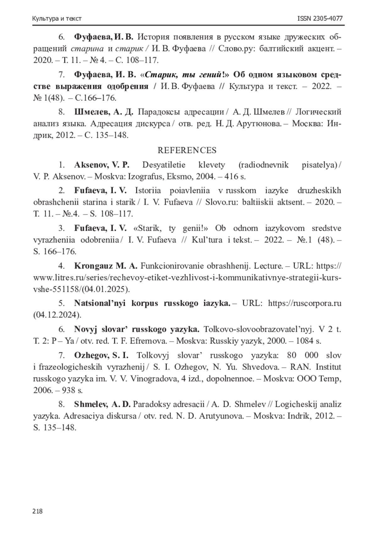 7. Фуфаева, И. В. “Старик, ты гений!” Об одном языковом средстве выражения одобрения / И. В. Фуфаева // Культура и текст. - 2022. - № 1(48). - С.166-176. EDN: OZVEFA