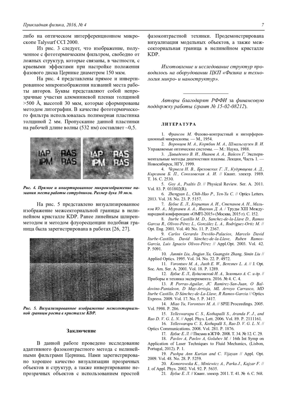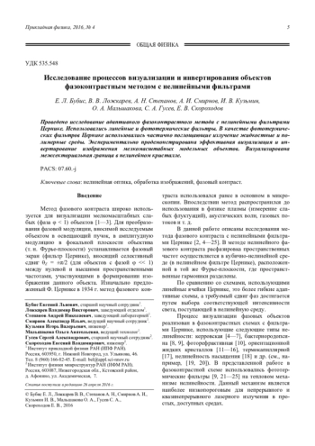 Бубис Е. Л., Ложкарев В. В., Cтепанов А. Н., Смирнов А. И., Кузьмин И. В., Мальшакова О. А., Гусев С. А., Скороходов Е. В. Исследование процессов визуализации и инвертирования объектов фазоконтрастным методом с нелинейными фильтрами 5