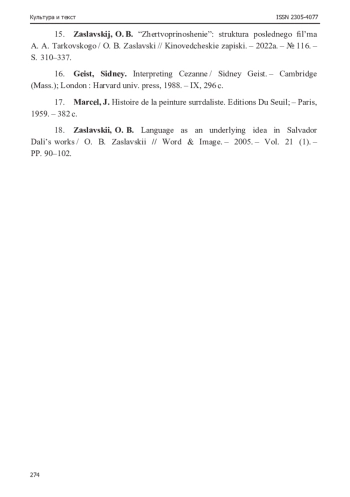 18. Zaslavskii, O. B. Language as an underlying idea in Salvador Dali’s works / O. B. Zaslavskii // Word & Image. - 2005. - Vol. 21 (1). - PP. 90-102.