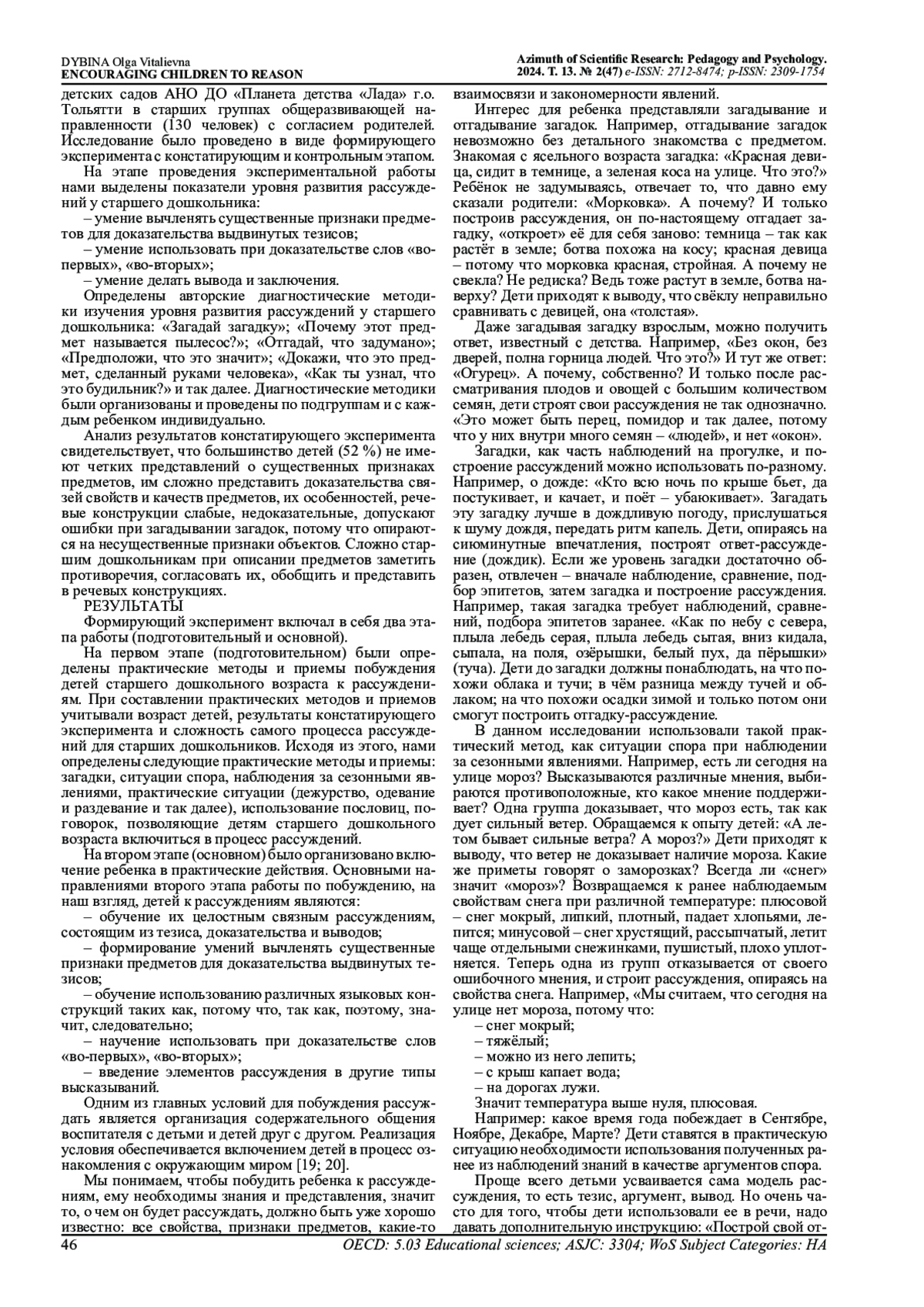 10. Шадрина Л. Г. Формирование у старших дошкольников элементарных представлений об особенностях текста-рассуждения // Бизнес. Образование. Право. 2019. № 2 (47). С. 440-444. EDN: GPTLOC