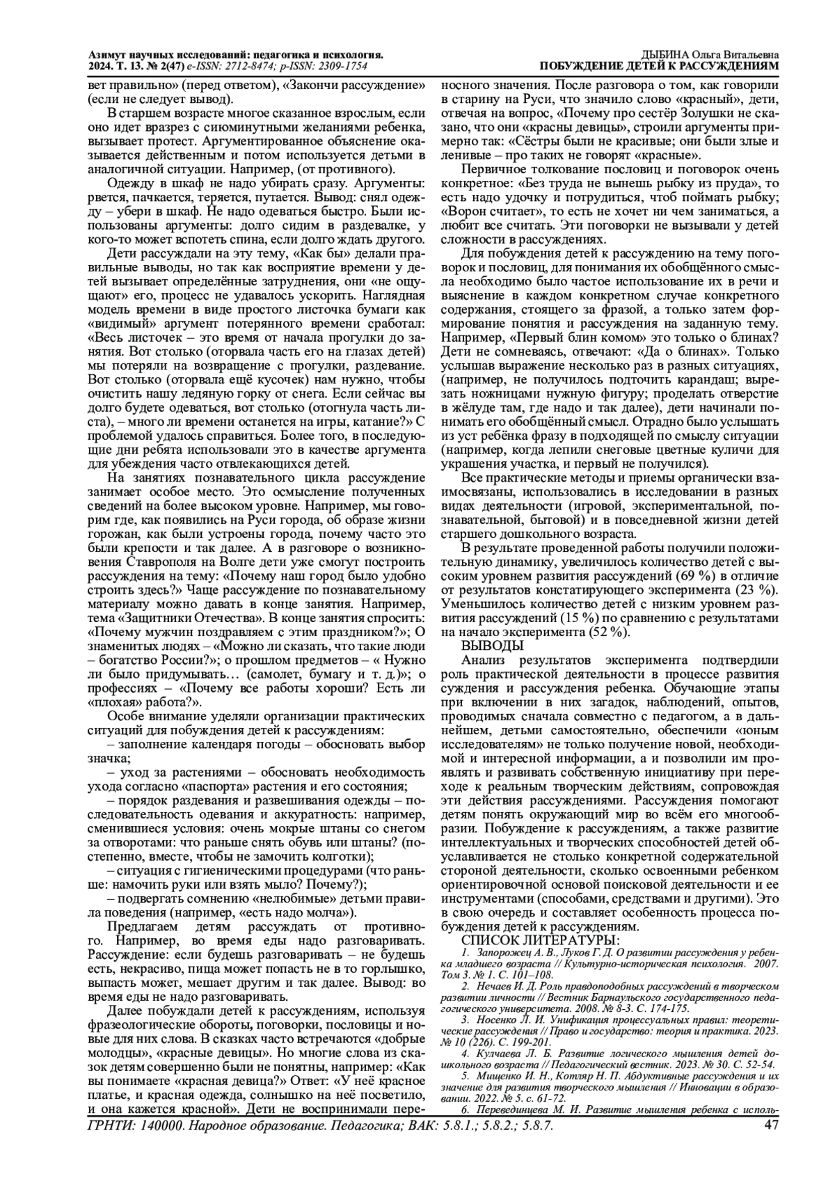 Научная новизна: в статье на основе использования комплекса методов и приемов исследована их роль в побуждении детей к рассуждениям.