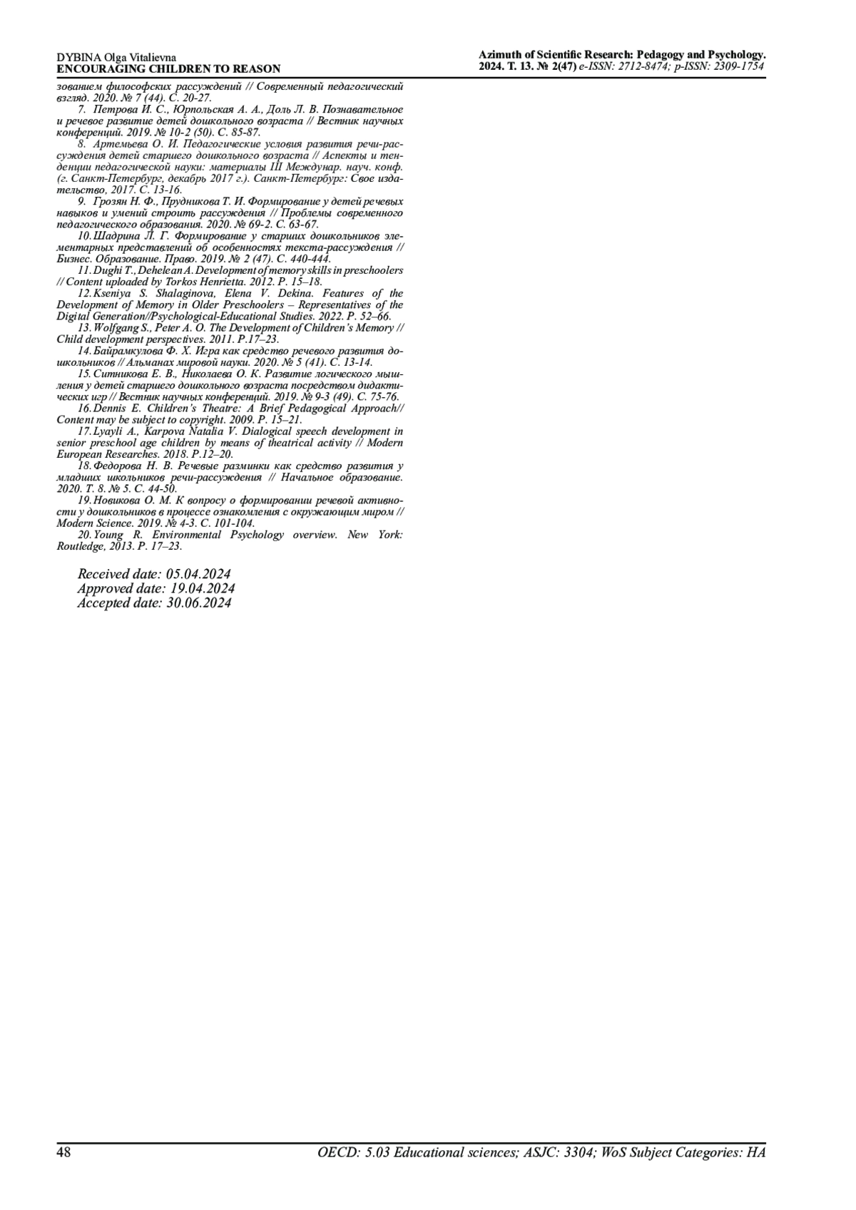 19. Новикова О. М. К вопросу о формировании речевой активности у дошкольников в процессе ознакомления с окружающим миром // Modern Science. 2019. № 4-3. С. 101-104. EDN: ZQCLBB