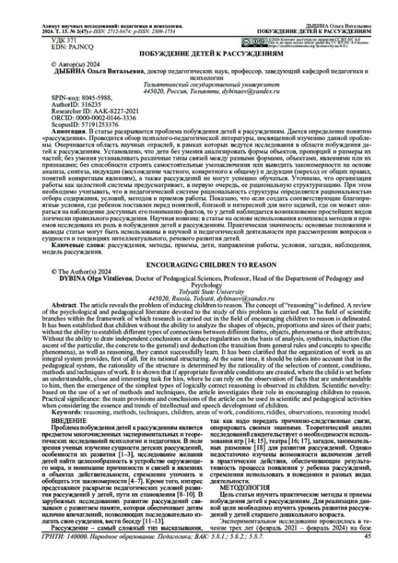 В статье раскрывается проблема побуждения детей к рассуждениям. Дается определение понятию «рассуждения». Проводится обзор психолого-педагогической литературы, посвященной изучению данной проблемы. Очерчивается область научных отраслей, в рамках которых ведутся исследования в области побуждения детей к рассуждениям. Установлено, что дети без умения анализировать формы объектов, пропорций и размеры их частей; без умения устанавливать различные типы связей между разными формами, объектами, явлениями или их признаками; без способности строить самостоятельные умозаключения или выводить закономерности на основе анализа, синтеза, индукции (восхождение частного, конкретного к общему) и дедукции (переход от общих правил, понятий конкретным явлениям), а также рассуждений не могут успешно обучаться. Уточнено, что организация работы как целостной системы предусматривает, в первую очередь, ее рациональную структуризацию. При этом необходимо учитывать, что в педагогической системе рациональность структуры определяется рациональностью отбора содержания, условий, методов и приемов работы. Показано, что если создать соответствующие благоприятные условия, где ребенок поставлен перед понятной, близкой и интересной для него задачей, где он может опираться на наблюдение доступных его пониманию фактов, то у детей наблюдается возникновение простейших видов логически правильного рассуждения.