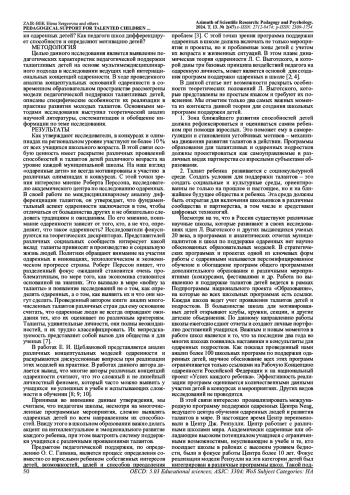 Методы: мультимеждисциплинарный подход к исследованию специфических характеристик интернациональных концепций одаренности, направлений и моделей педагогической поддержки талантливых детей.