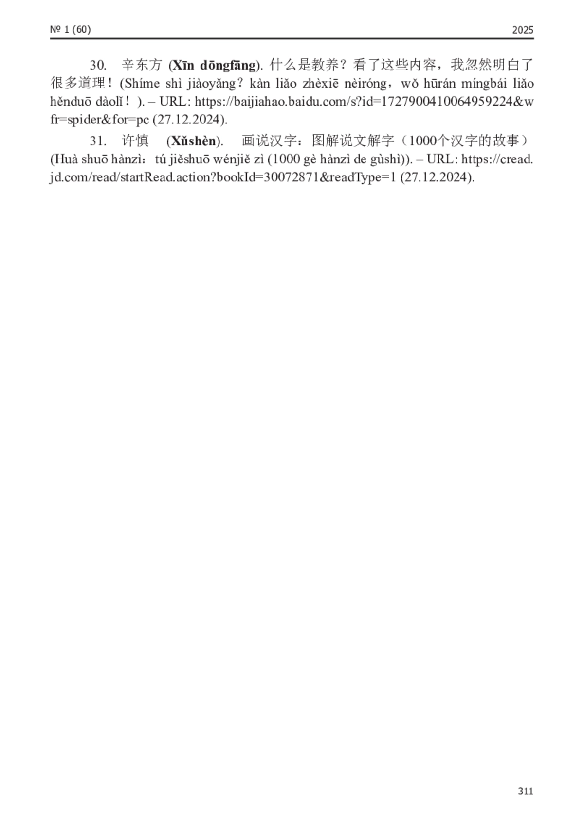 30. 辛东方 (Xīn dōngfāng). 什么是教养 看了这些内容 我忽然明白了很多道理 (Shíme shì jiàoyǎng kàn liǎo zhèxiē nèiróng wǒ hūrán míngbái liǎo hěnduō dàolǐ ). - URL: https://baijiahao.baidu.com/s?id=1727900410064959224&wfr=spider&for=pc (27.12.2024).