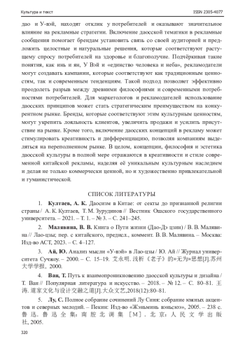 4. Ван, Т. Путь к взаимопроникновению даосской культуры и дизайна / Т. Ван // Популярная литература и искусство. - 2018. - № 12. - С. 80-81. 王涛.道家文化与设计交融之道[J].大众文艺,2018(12):80-81.