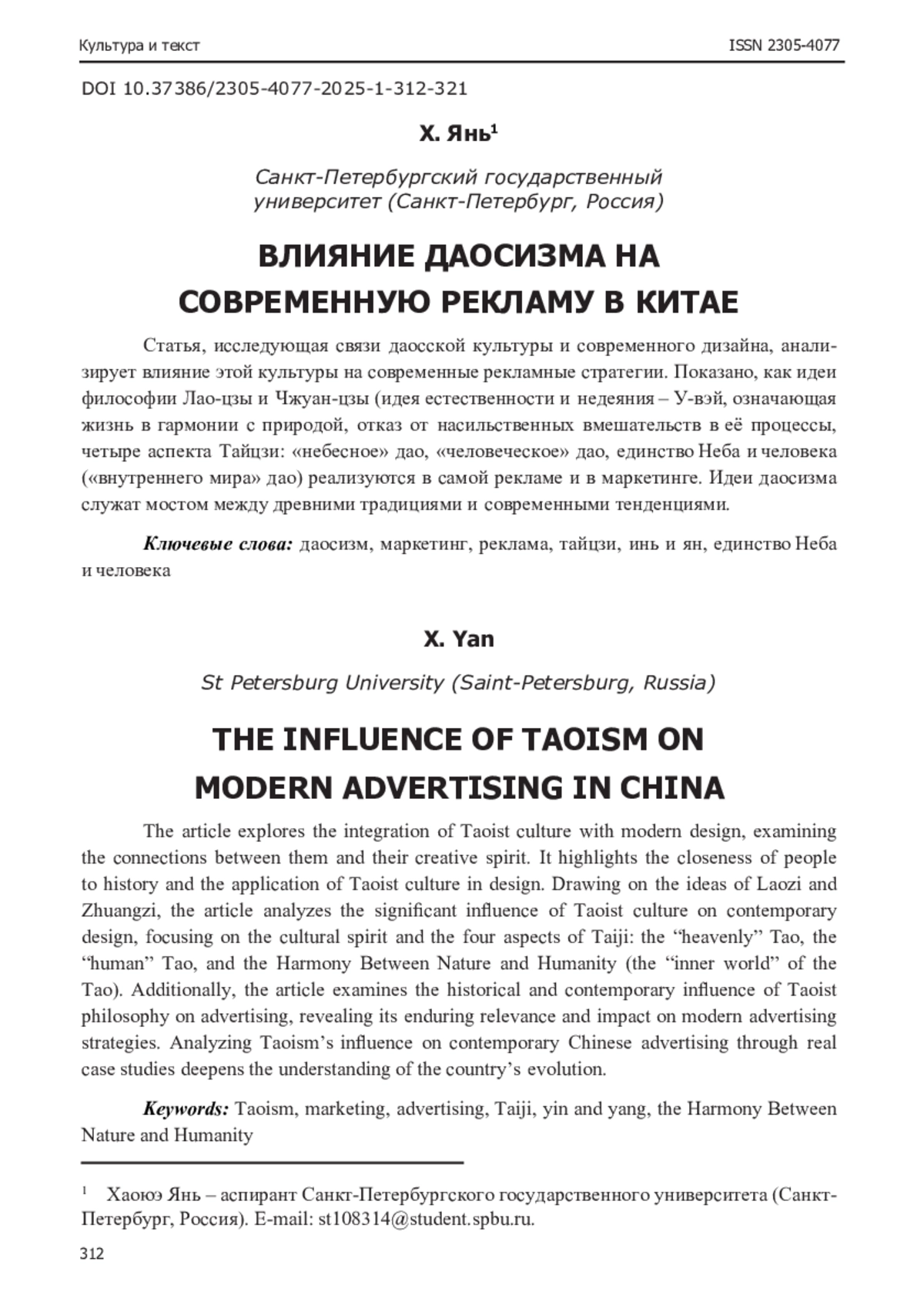 Статья, исследующая связи даосской культуры и современного дизайна, анализирует влияние этой культуры на современные рекламные стратегии. Показано, как идеи философии Лао-цзы и Чжуан-цзы (идея естественности и недеяния - У-вэй, означающая жизнь в гармонии с природой, отказ от насильственных вмешательств в её процессы, четыре аспекта Тайцзи: «небесное» дао, «человеческое» дао, единство Неба и человека («внутреннего мира» дао) реализуются в самой рекламе и в маркетинге. Идеи даосизма служат мостом между древними традициями и современными тенденциями.