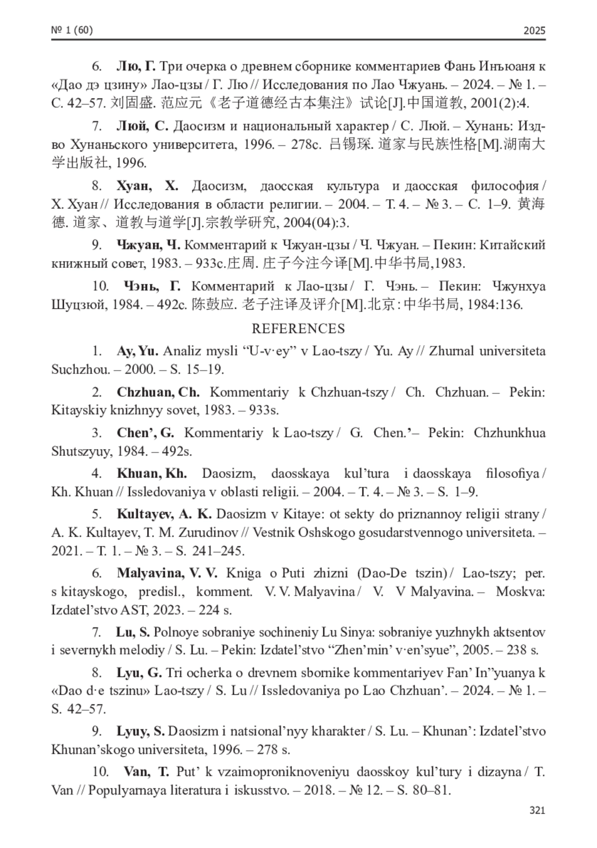 1. Култаев, А. К. Даосизм в Китае: от секты до признанной религии страны / А. К. Култаев, Т. М. Зурудинов // Вестник Ошского государственного университета. - 2021. - Т. 1. - № 3. - С. 241-245. EDN: RPWUKJ