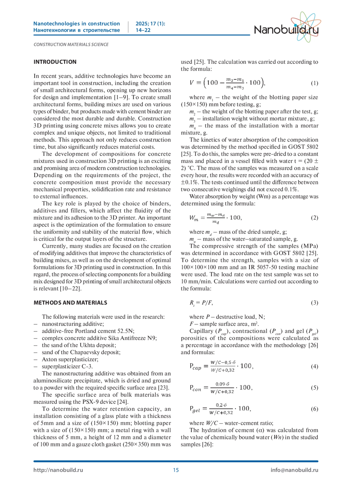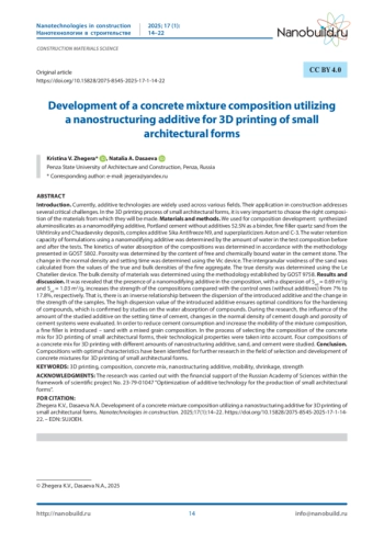Введение. В настоящее время аддитивные технологии широко используются в различных сферах деятельности. Использование таких технологий в строительстве помогает решить ряд очень важных вопросов. При 3D печати для изготовления малых архитектурных форм очень важно правильно подобрать составы материалов, из которых они будут изготавливаться. Материалы и методы. Для разработки состава в качестве наномодифицирующей добавки применялись синтезированные алюмосиликаты, в качестве вяжущего - портландцемент бездобавочный 52,5Н, мелкий заполнитель - песок кварцевый Ухтинского и Чаадаевского месторождения, комплексная добавка Sika Antifreeze N9, суперпластификатор Axton, суперпластификатор С-3. Водоудерживающую способность составов с применением наномодифицирующей добавки определяли по количеству воды в исследуемом составе до и после проведения испытаний. Кинетика водопоглощения составов определялась в соответствии с методикой, представленной в ГОСТ 5802. Пористость определялась по содержанию свободной и химически связанной воды в цементном камне. Изменение нормальной густоты и сроков схватывания определялось с использованием прибора Вика. Межзерновая пустотность песка вычислялась по значениям истинной и насыпной плотностей мелкого заполнителя. Истинная плотность определялась с помощью прибора Ле-Шателье. Насыпная плотность материалов определялась с помощью методики, установленной ГОСТ 9758. Результаты и обсуждения. Выявлено, что присутствие в составе наномодифицирующей добавки дисперсностью Sуд = 0,69 м2/г и Sуд = 1,03 м2/г повышает прочность составов по сравнению с контрольными (без добавки) от 7% до 17,8% соответственно. То есть наблюдается обратная зависимость между дисперсностью вводимой добавки и изменением прочности образцов. Высокое значение дисперсности вводимой добавки обеспечивает оптимальные для твердения составов условия, что подтверждается исследованиями по водопоглощению составов. В ходе исследований оценивалось влияние количества исследуемой добавки на сроки схватывания цемента, изменение нормальной густоты цементного теста и пористости цементных систем. С целью снижения расхода цемента и увеличения подвижности состава смеси вводится мелкий заполнитель - песок со смешанным зерновым составом. В процессе подбора состава бетонной смеси для 3D-печати малых архитектурных форм учитывались их технологические свойства. Исследовались четыре состава бетонной смеси для 3D-печати с разным количеством содержания наноструктурирующей добавки, песка, цемента. Выводы. Определены составы с оптимальными характеристиками для проведения дальнейших исследований в области подбора разработки составов бетонных смесей для 3D-печати малых архитектурных форм.