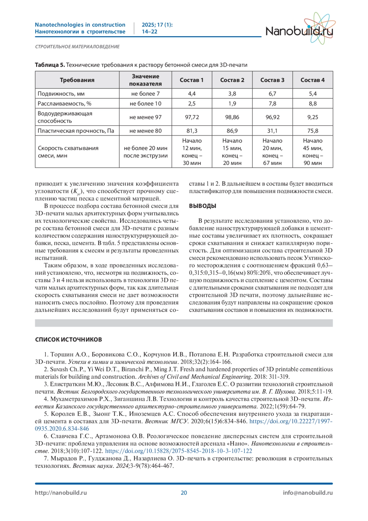 6. Славчева Г.С., Артамонова О.В. Реологическое поведение дисперсных систем для строительной 3D-печати: проблема управления на основе возможностей арсенала “Нано”. Нанотехнологии в строительстве. 2018;3(10):107-122. DOI: 10.15828/2075-8545-2018-10-3-107-122