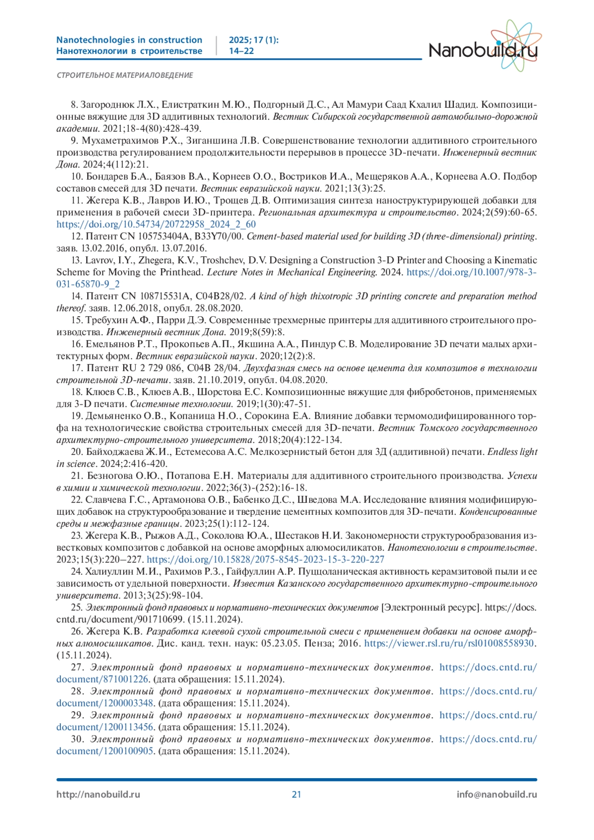 11. Жегера К.В., Лавров И.Ю., Трощев Д.В. Оптимизация синтеза наноструктурирующей добавки для применения в рабочей смеси 3D-принтера. Региональная архитектура и строительство. 2024;2(59):60-65. DOI: 10.54734/20722958_2024_2_60