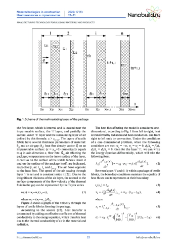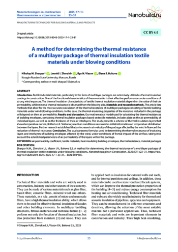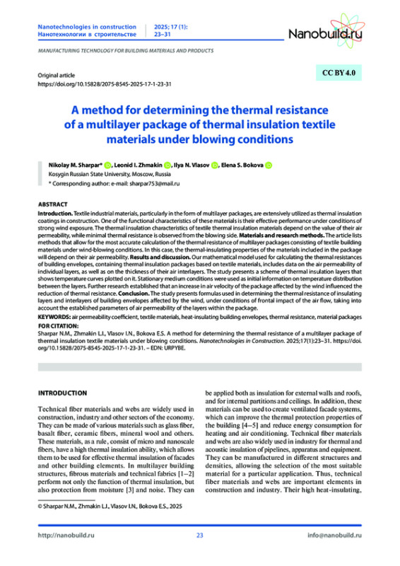 Введение. Текстильные материалы технического назначения в виде многослойных пакетов находят широкое применение в качестве теплоизоляционных покрытий в строительстве. Одной из функциональных характеристик такого рода материалов является их эффективная работа в условиях интенсивного обдува ветром. Теплоизоляционные характеристики текстильных теплоизоляционных материалов зависят от величины их воздухопроницаемости, при этом минимальное термическое сопротивление наблюдается со стороны обдува. Материалы и методы исследования. В статье предложена методика, позволяющая рассчитать термическое сопротивление многослойного пакета, состоящего из текстильных строительных материалов в условиях обдува. Показано, что теплоизоляционные свойства материалов, входящих в состав пакета, зависят от их воздухопроницаемости. Результаты и обсуждение. Рассматриваемая в работе математическая модель по определению термических сопротивлений ограждающих конструкций, содержащих теплоизоляционные пакеты на основе текстильных материалов, включает данные по воздухопроницаемости отдельных слоёв, а также по толщине их воздушных прослоек. В работе приведена схема теплоизоляционных слоев, включающая температурные кривые. В качестве исходной информации по распределению температур в слоях приняты условия неподвижной среды, а также предположение, что повышение скорости воздуха при обдуве пакета влияет на уменьшение его термического сопротивления. Заключение. В работе приведены уравнения по определению термических сопротивлений теплоизоляционных слоев и прослоек ограждающих конструкций, с учетом их воздухопроницаемости при обдуве воздушным потоком разной степени интенсивности.