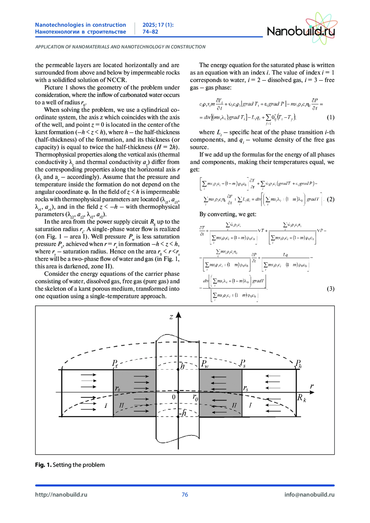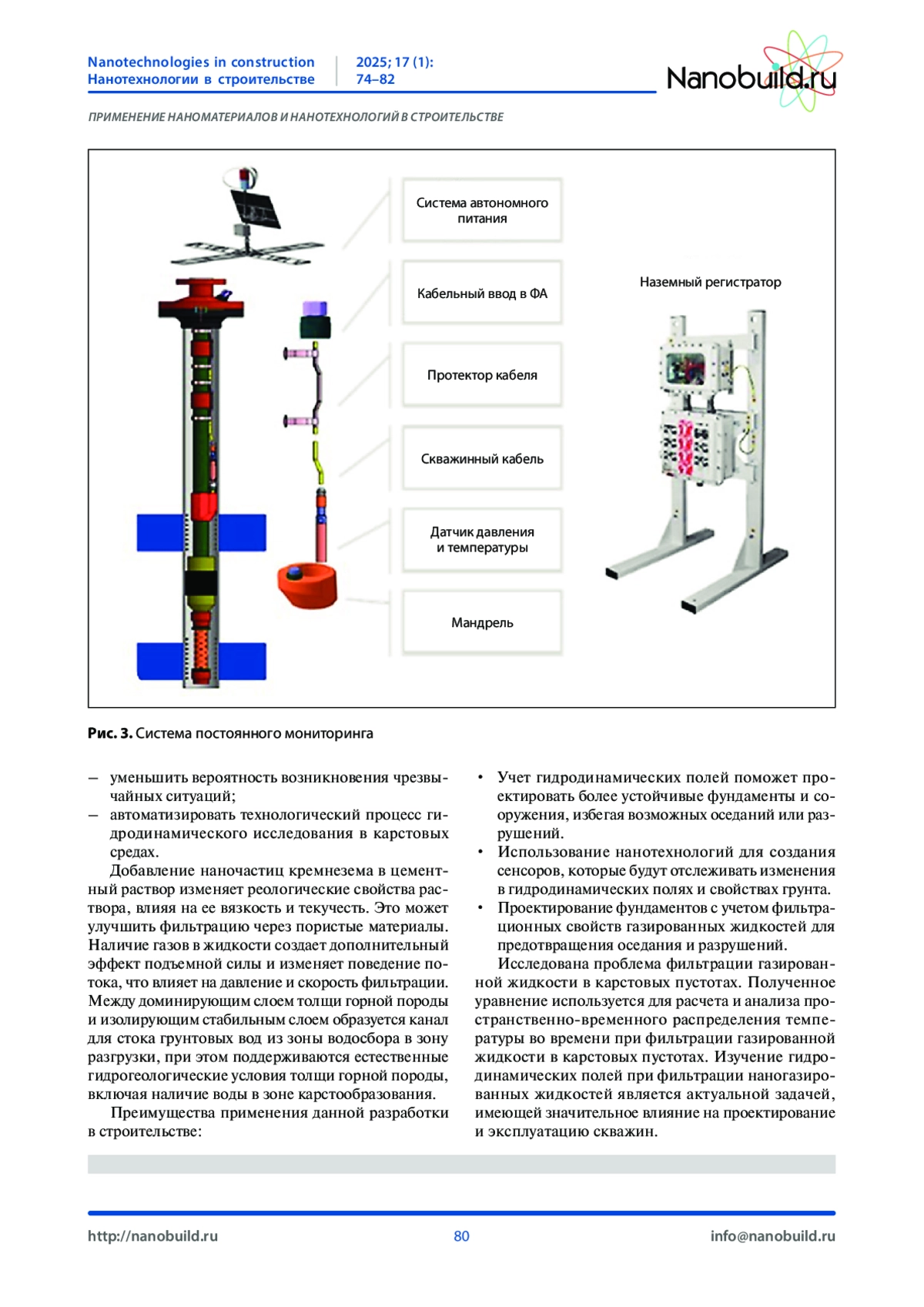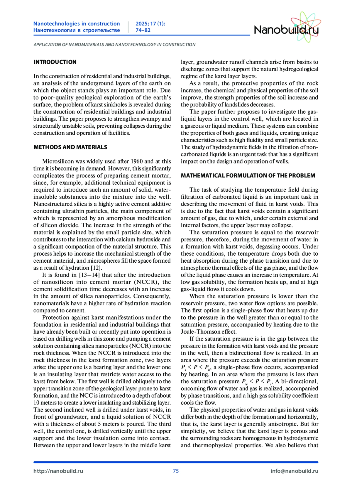 Введение. При строительстве жилых домов и промышленных зданий большую роль играет анализ подземных слоев земли, на котором стоит фундамент объекта. В связи с некачественной геологоразведкой поверхности земли при постройке жилых домов и промышленных зданий обнаруживается проблема карстовых провалов. В работе предлагается провести работы по укреплению водонасыщенных и неустойчивых грунтов для того, чтобы предотвратить обрушение при строительстве и эксплуатации объектов различного назначения. Бурение скважин в зоне карстообразования и нагнетание укрепляющего материала является основным способом защиты от проявления карстовых явлений. В работе исследуются газожидкостные слои (карстовые путоты) с содержанием нанокристаллов, которые находятся в газообразной или жидкостной среде. Изучение гидродинамических полей является актуальной задачей, имеющей значительное влияние на проектирование и эксплуатацию объектов. Методы и материалы. Наиболее эффективным способом защиты от карстовых явлений для уже построенных или вновь возводимых зданий и промышленных объектов является бурение скважин в зоне карстообразования и нагнетание укрепляющего материала. В результате исследования, проведенного после введения нанокремнезема в цементный раствор, было установлено, что время затвердевания цемента сокращается с увеличением количества наночастиц нанокремнеземов, т. е. наночастицы обладают большей скоростью реакции гидратации по сравнению с цементом. Усиленный нанокремнеземом цементный раствор добавляется в породу карстовой зоны, образуя нижний изолирующий слой и верхний стабилизирующий слой, предотвращающий проникновение глубинных вод в карстовую зону и стабилизирующий поверхность карстовой породы. На стадии карстообразования, расположенной в границах призмы обрушения и соответствующей ширине нижнего слоя, создаются два слоя верхнего и нижнего поддерживающего слоя. Каналы стока грунтовых вод от водосборов к зонам разгрузки формируются между опорными слоями толщиной в породу и изолирующими стабилизаторами, которые поддерживают естественный гидрогеологический режим толщи пород, содержащих карстовые слои воды. В результате повышаются защитные свойства горной породы при проявлении признаков карста, улучшаются физико-химические и несущие свойства грунта, повышаются прочностные свойства грунта и снижается вероятность возникновения оползней. Результаты. Теоретически изучены гидродинамические поля при фильтрации наногазированных жидкостей в карстовых пустотах. Обсуждение. Установив на контрольную скважину постоянную автоматизированную систему контроля датчиков движения, давления и температуры жидкости и газа в карстовых пустотах, мы сможем контролировать динамику основных гидродинамических параметров карстовых пустот, позволяя оценивать текущий режим карстовых пустот и при возникновении опасности сигнализировать об этом экстренные службы и жильцов дома. С помощью мониторинга работы датчиков с применением искусственного интеллекта возможно прогнозировать возникновение и развитие критических ситуаций. Выводы. Добавление наночастиц кремнезема в цементный раствор изменяет реологические свойства раствора, влияя на его вязкость и текучесть. Каналы стока грунтовых вод от водосборов к зонам ра