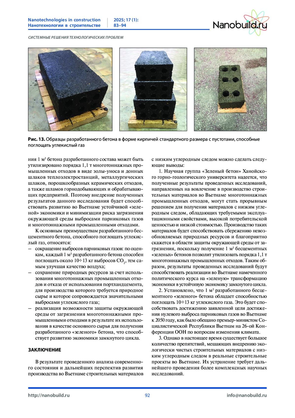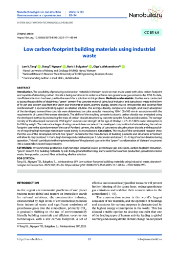 Введение. Рассматривается возможность производства во Вьетнаме строительных материалов на основе техногенных отходов, обладающих низким углеродным следом и способных поглощать углекислый газ, для достижения к 2050 году нулевого выброса парниковых газов. До настоящего времени поискам решения этой проблемы уделялось недостаточное внимание. Методы и материалы. Были проведены исследования с целью оценки возможности получения «зеленого» бесцементного бетонного материала, используя для этого местные промышленные отходы и отходы переработки продукции сельского хозяйства в виде золы-уноса и донного шлака мусоросжигательной электростанции «Green Star», шламовых отходов производства глинозема, керамических отходов, известкового порошка и кокосового волокна в сочетании со специальным активирующим щелочным раствором. Среднюю плотность, прочность на сжатие и водопоглощение разработанного бесцементного бетона определяли на образцах-кубах размером 100x100x100 мм в соответствии с требованиями действующих вьетнамских стандартов. Способность полученного бетона поглощать углекислый газ оценивали с помощью разработанного метода путем измерения массы углекислого газа, поглощенного бетонными образцами. Результаты и обсуждение. Средняя плотность разработанного бетона составляет 1950 кг/м3; прочность на сжатие в возрасте 28 суток - 7,5+11,5 МПа; водопоглощение - 8+10% масс. К основным достоинствам применения бесцементного бетона разработанного состава относятся снижение углеродного следа благодаря отказу от использования портландцемента, способность бетона поглощать углекислый газ и возможность утилизации многотоннажных техногенных отходов при его изготовлении. Заключение. Результаты проведенных исследований показывают, что использование разработанного бесцементного «зеленого» бетона для изготовления строительных изделий и конструкций во Вьетнаме позволит утилизовать порядка 1,1 т многотоннажных промышленных отходов в расчете на 1 кубический метр и в ходе эксплуатации поглотить 10-13 кг углекислого газа. Это будет способствовать реализации намеченного курса на «зеленую» трансформацию экономики Вьетнама в устойчивую экономику замкнутого цикла.
