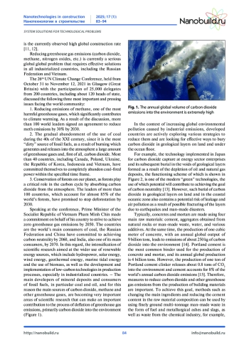 По мере того, как актуальные экологические проблемы нашей планеты становятся все более глобальными и требующими незамедлительного поиска их рациональных решений, строительная отрасль, характеризующаяся высоким уровнем загрязнения окружающей среды производственными отходами и значительными выбросами в атмосферу парниковых газов и, в первую очередь CO2, постепенно переходит к использованию экологически чистых строительных материалов и эффективных строительных технологий, обладающих низким углеродным следом. Комплекс эффективных и экономически обоснованных принимаемых мер позволит предотвратить дальнейшее истончение озонового слоя, сократить выбросы парниковых газов и стабизировать их концентрацию в атмосфере [1–10].