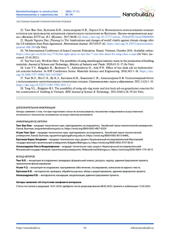 22. Танг Ван Лам, Булгаков Б.И., Александрова О.В., Ларсен О.А. Возможность использования зольных остатков для производства материалов строительного назначения во Вьетнаме. Научно-теоретический журнал “Вестник БГТУим. В.Г. Шухова”. 2017;06:06-12. DOI: 10.12737/article_5926a059214ca0.89600468
