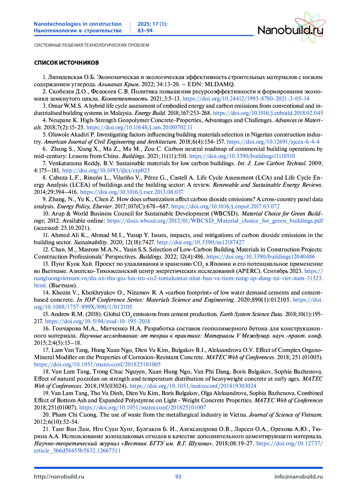 1. Ляпидевская О.Б. Экономическая и экологическая эффективность строительных материалов с низким содержанием углерода. Альманах Крым. 2022; 34:13-20. -.