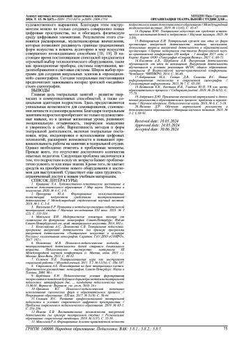 3. Васильева Е.Р. Принципы и методы организации любительской театральной студии // Научные исследования XXI века. 2023. № 2 (22). С. 331-334. EDN: MMNZXL