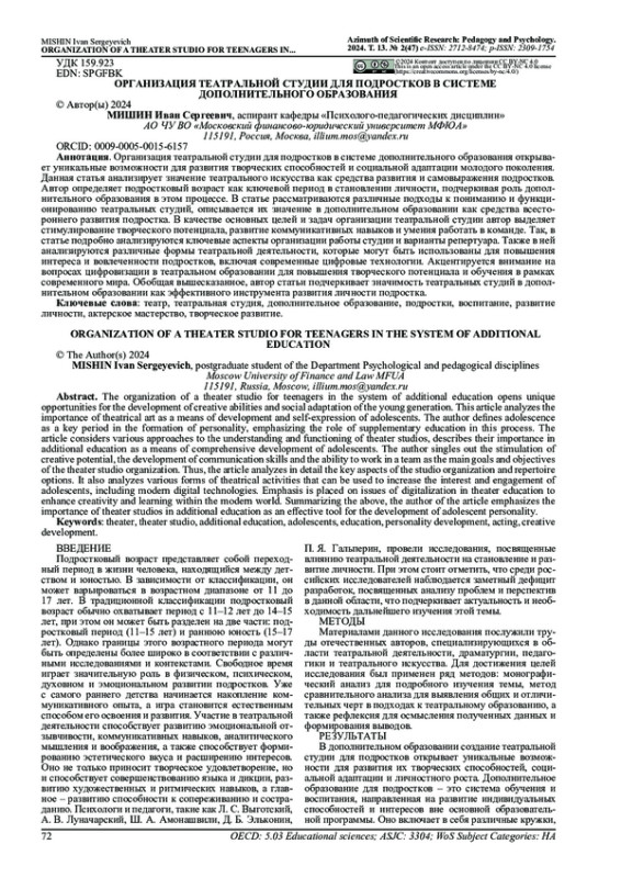 Организация театральной студии для подростков в системе дополнительного образования открывает уникальные возможности для развития творческих способностей и социальной адаптации молодого поколения. Данная статья анализирует значение театрального искусства как средства развития и самовыражения подростков. Автор определяет подростковый возраст как ключевой период в становлении личности, подчеркивая роль дополнительного образования в этом процессе. В статье рассматриваются различные подходы к пониманию и функционированию театральных студий, описывается их значение в дополнительном образовании как средства всестороннего развития подростка. В качестве основных целей и задач организации театральной студии автор выделяет стимулирование творческого потенциала, развитие коммуникативных навыков и умения работать в команде. Так, в статье подробно анализируются ключевые аспекты организации работы студии и варианты репертуара. Также в ней анализируются различные формы театральной деятельности, которые могут быть использованы для повышения интереса и вовлеченности подростков, включая современные цифровые технологии. Акцентируется внимание на вопросах цифровизации в театральном образовании для повышения творческого потенциала и обучения в рамках современного мира. Обобщая вышесказанное, автор статьи подчеркивает значимость театральных студий в дополнительном образовании как эффективного инструмента развития личности подростка.
