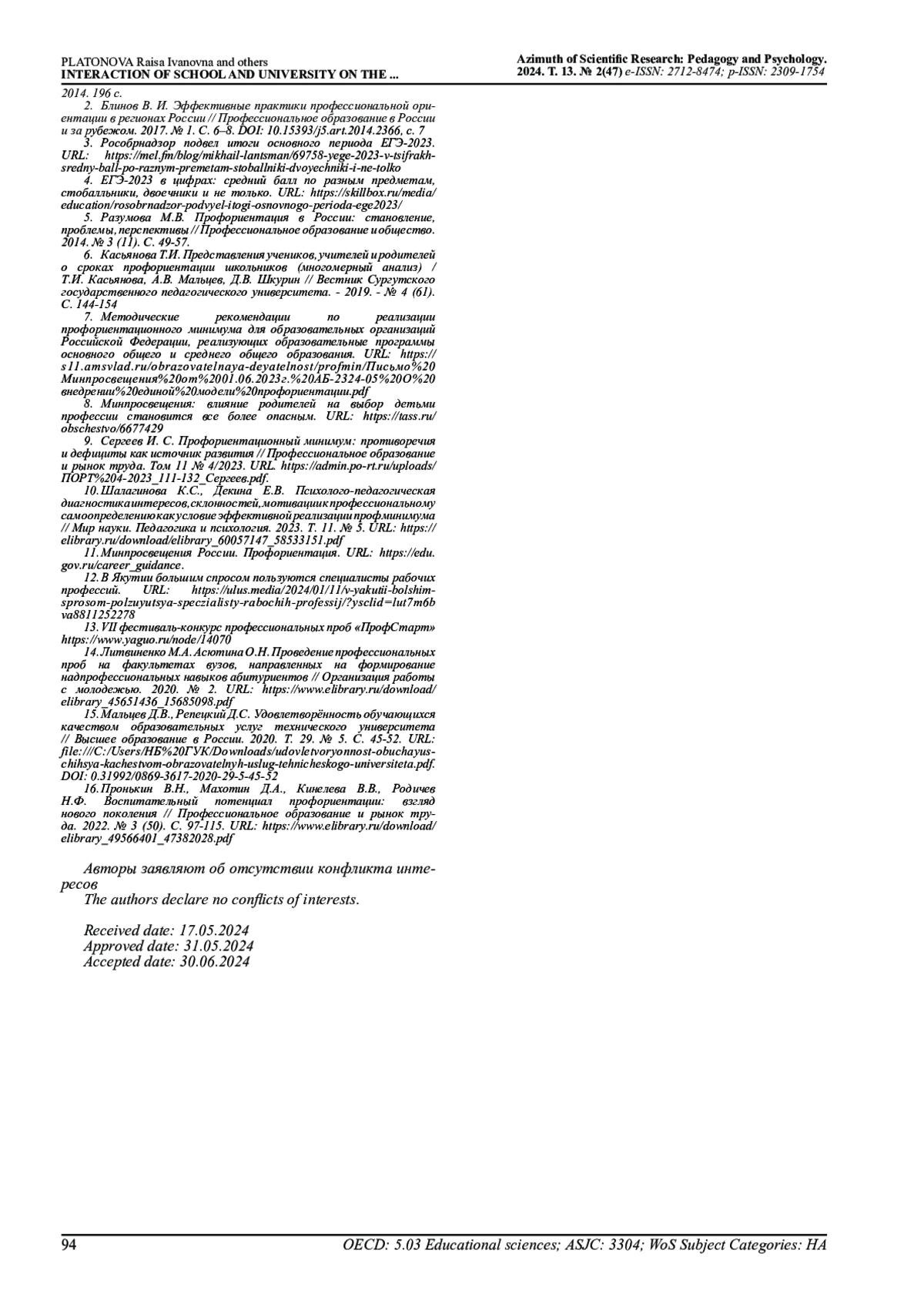 9. Сергеев И. С. Профориентационный минимум: противоречия и дефициты как источник развития // Профессиональное образование и рынок труда. Том 11 № 4/2023 URL: https://admin.po-rt.ru/uploads/ПОРТ%204-2023_111-132_Сергеев.pdf. EDN: NSPOKS