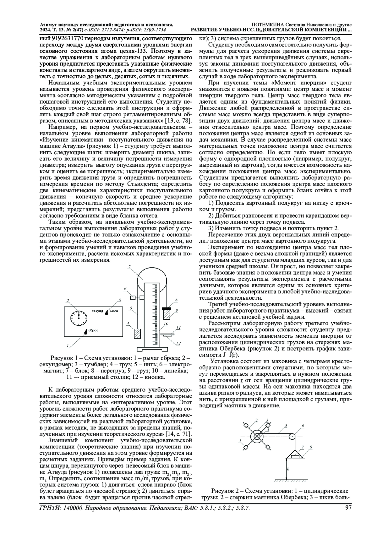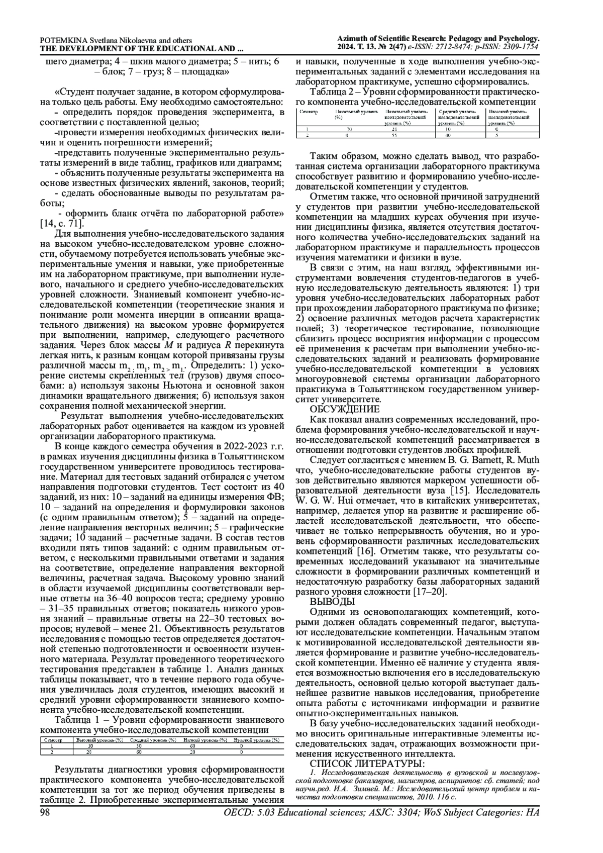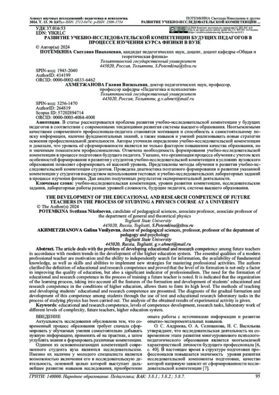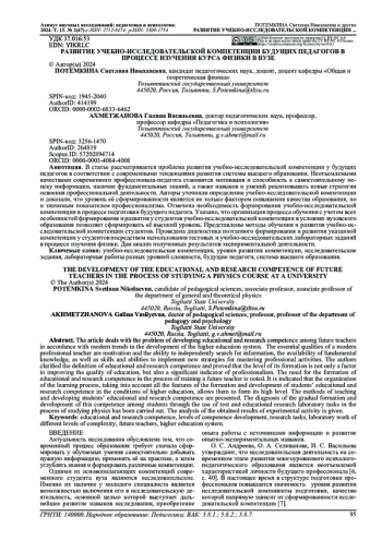 14. Потемкина СН., Сарафанова В.А., Ясников И.С. Многоуровневая организация лабораторных занятий по физике как средство формирования исследовательских компетенций студентов, 2022, журнал “Высшее образование сегодня”, №3-4, с. 68-73. EDN: EFYEXJ