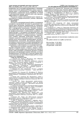 6. Полевая Н.М., Ситникова В.В. Формирование учебной и профессиональной мотивации студентов в процессе обучения в вузе // Азимут научных исследований: педагогика и психология. 2023. Т.12. № 1(42). С. 100-103. EDN: YPXNXC