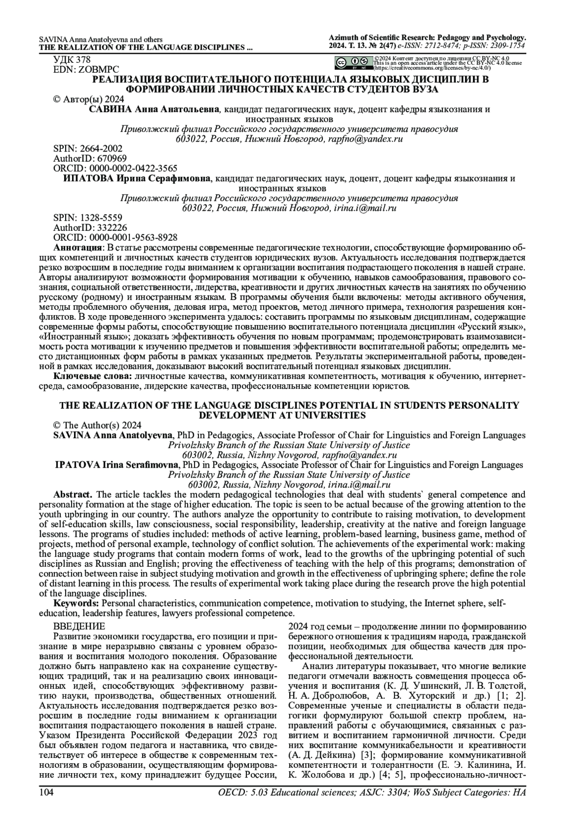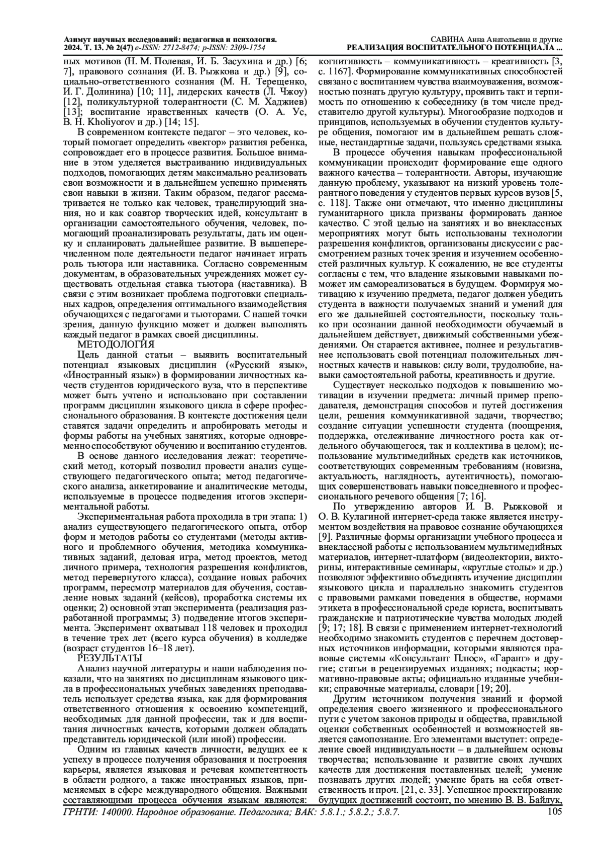 В статье рассмотрены современные педагогические технологии, способствующие формированию общих компетенций и личностных качеств студентов юридических вузов. Актуальность исследования подтверждается резко возросшим в последние годы вниманием к организации воспитания подрастающего поколения в нашей стране. Авторы анализируют возможности формирования мотивации к обучению, навыков самообразования, правового сознания, социальной ответственности, лидерства, креативности и других личностных качеств на занятиях по обучению русскому (родному) и иностранным языкам. В программы обучения были включены: методы активного обучения, методы проблемного обучения, деловая игра, метод проектов, метод личного примера, технология разрешения конфликтов. В ходе проведенного эксперимента удалось: составить программы по языковым дисциплинам, содержащие современные формы работы, способствующие повышению воспитательного потенциала дисциплин «Русский язык», «Иностранный язык»; доказать эффективность обучения по новым программам; продемонстрировать взаимозависимость роста мотивации к изучению предметов и повышения эффективности воспитательной работы; определить место дистанционных форм работы в рамках указанных предметов. Результаты экспериментальной работы, проведенной в рамках исследования, доказывают высокий воспитательный потенциал языковых дисциплин.