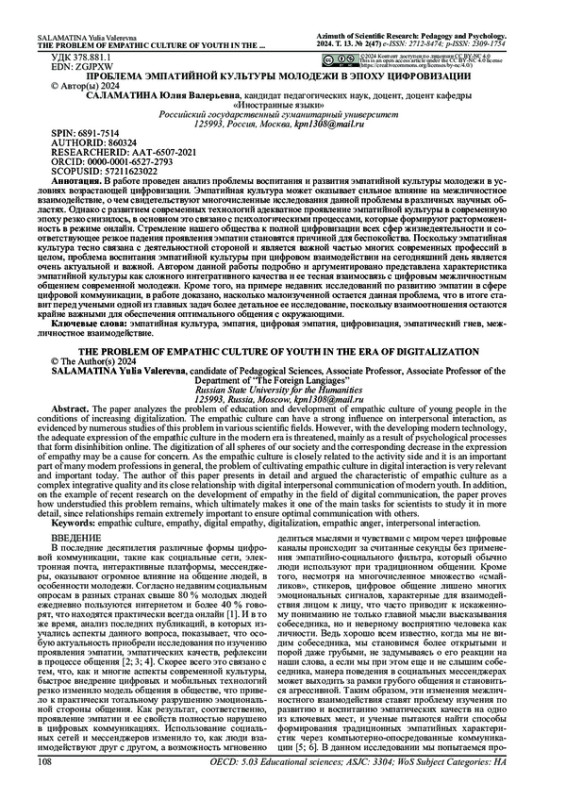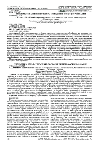 В работе проведен анализ проблемы воспитания и развития эмпатийной культуры молодежи в условиях возрастающей цифровизации. Эмпатийная культура может оказывает сильное влияние на межличностное взаимодействие, о чем свидетельствуют многочисленные исследования данной проблемы в различных научных областях. Однако с развитием современных технологий адекватное проявление эмпатийной культуры в современную эпоху резко снизилось, в основном это связано с психологическими процессами, которые формируют расторможенность в режиме онлайн. Стремление нашего общества к полной цифровизации всех сфер жизнедеятельности и соответствующее резкое падения проявления эмпатии становятся причиной для беспокойства. Поскольку эмпатийная культура тесно связана с деятельностной стороной и является важной частью многих современных профессий в целом, проблема воспитания эмпатийной культуры при цифровом взаимодействии на сегодняшний день является очень актуальной и важной. Автором данной работы подробно и аргументировано представлена характеристика эмпатийной культуры как сложного интегративного качества и ее тесная взаимосвязь с цифровым межличностным общением современной молодежи. Кроме того, на примере недавних исследований по развитию эмпатии в сфере цифровой коммуникации, в работе доказано, насколько малоизученной остается данная проблема, что в итоге ставит перед учеными одной из главных задач более детальное ее исследование, поскольку взаимоотношения остаются крайне важными для обеспечения оптимального общения с окружающими.