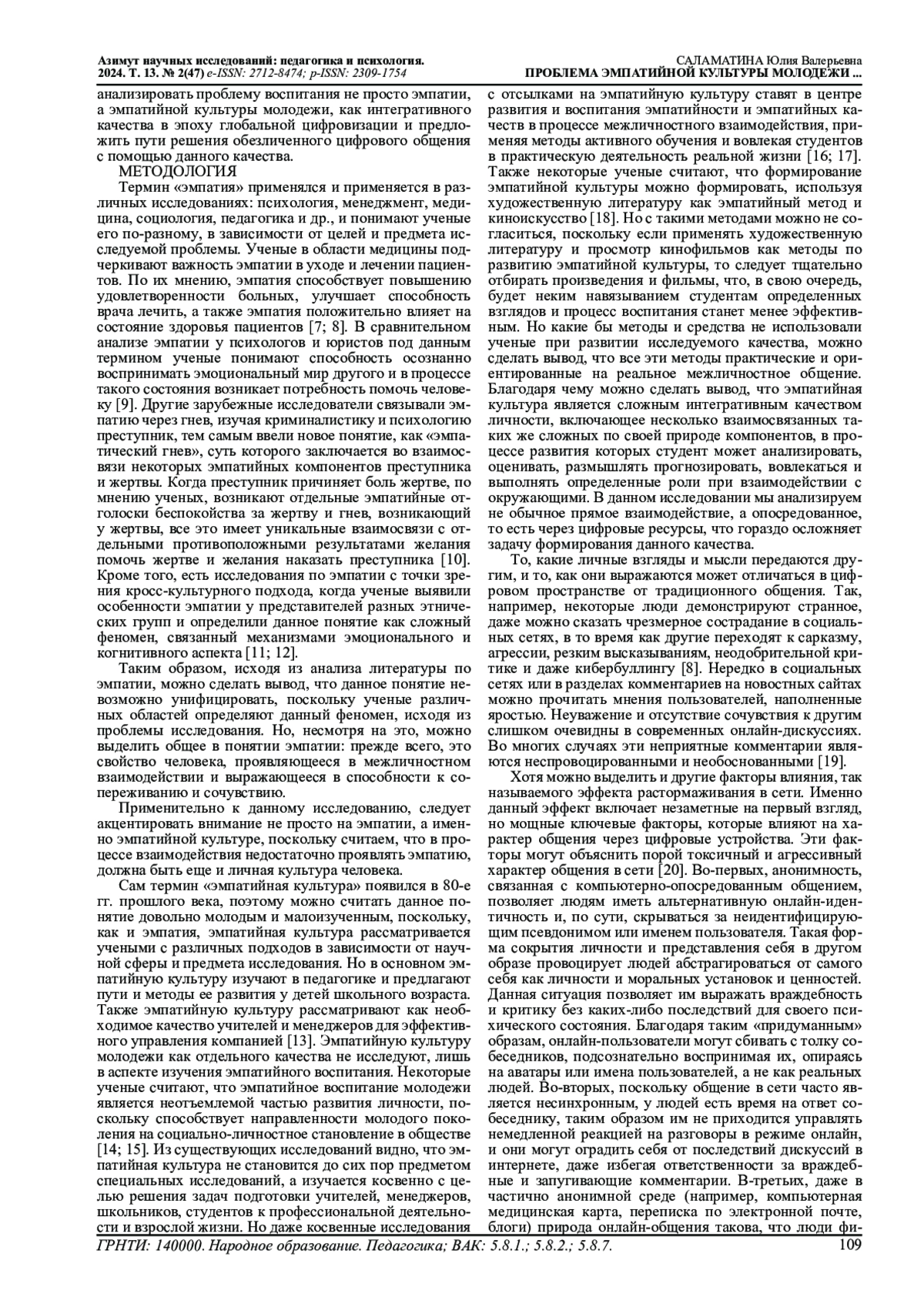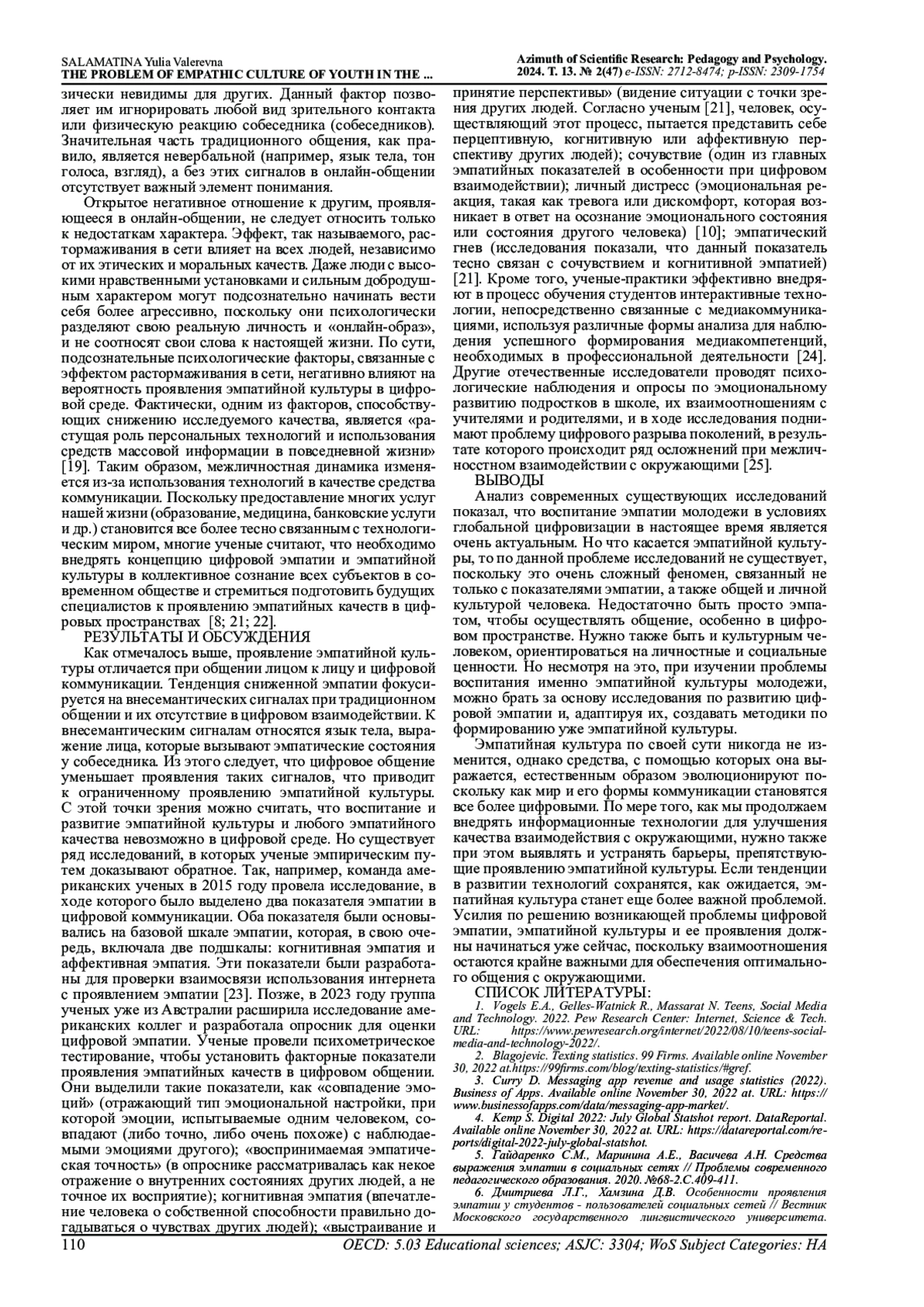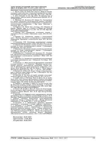 6. Дмитриева Л.Г., Хамзина Д.В. Особенности проявления эмпатии у студентов - пользователей социальных сетей // Вестник Московского государственного лингвистического университета. Образование и педагогические науки. 2020. №1 (834). С.175-187. EDN: VPAHSR