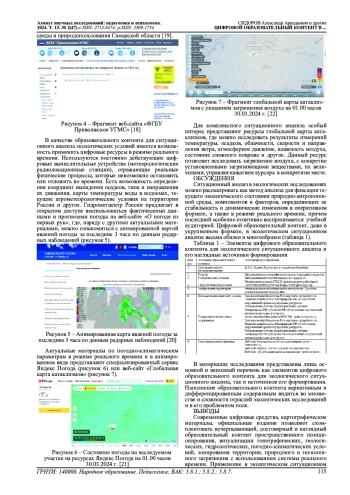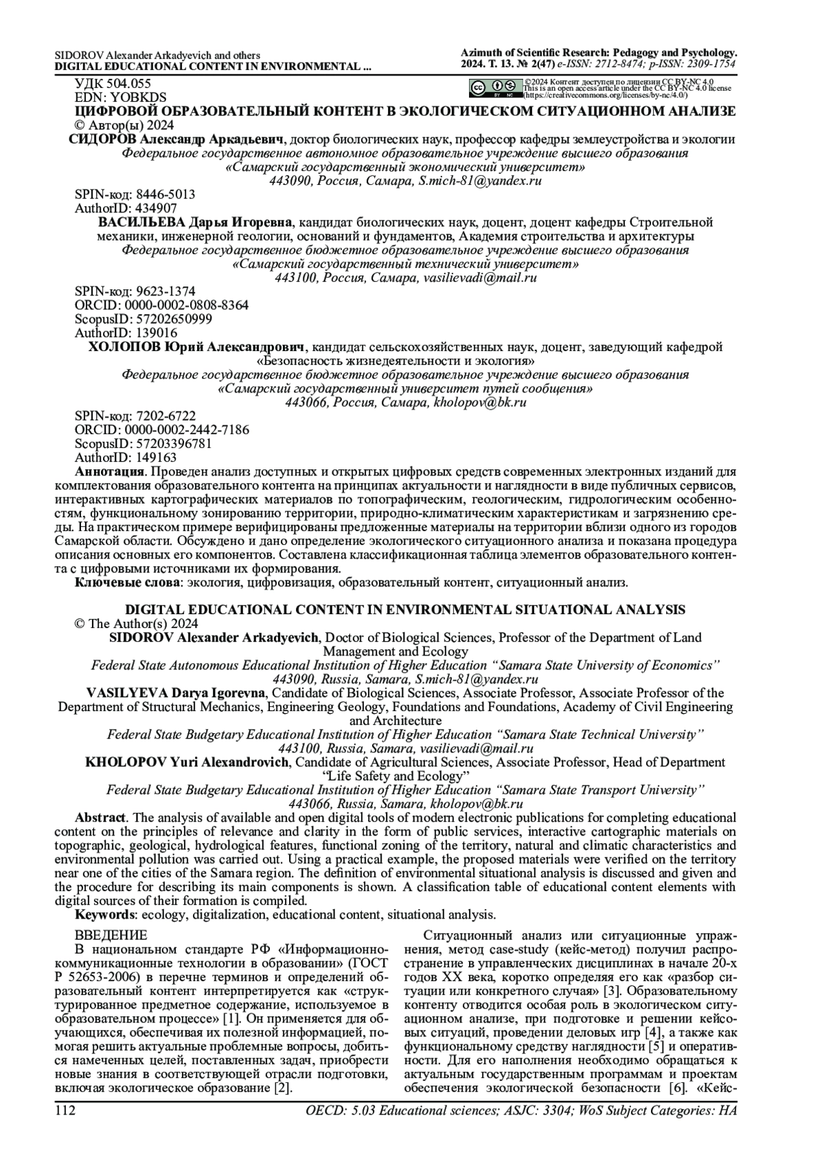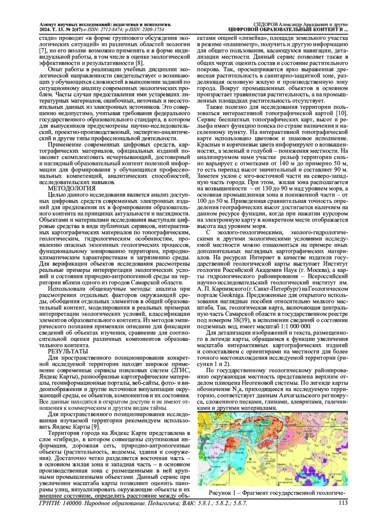 Проведен анализ доступных и открытых цифровых средств современных электронных изданий для комплектования образовательного контента на принципах актуальности и наглядности в виде публичных сервисов, интерактивных картографических материалов по топографическим, геологическим, гидрологическим особенностям, функциональному зонированию территории, природно-климатическим характеристикам и загрязнению среды. На практическом примере верифицированы предложенные материалы на территории вблизи одного из городов Самарской области. Обсуждено и дано определение экологического ситуационного анализа и показана процедура описания основных его компонентов. Составлена классификационная таблица элементов образовательного контента с цифровыми источниками их формирования.