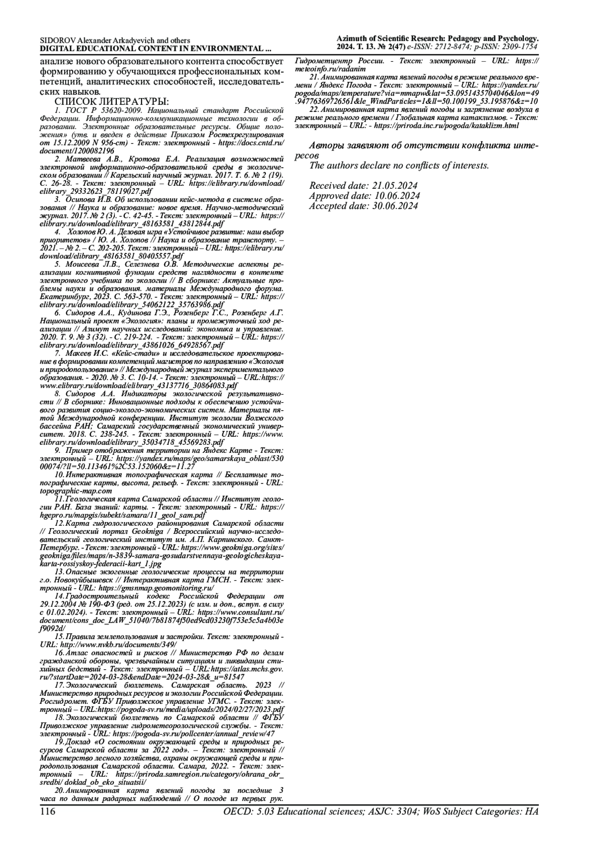 8. Сидоров А.А. Индикаторы экологической результативности // В сборнике: Инновационные подходы к обеспечению устойчивого развития социо-эколого-экономических систем. Материалы пятой Международной конференции. Институт экологии Волжского бассейна РАН; Самарский государственный экономический университет. 2018. С. 238-245. - Текст: электронный - URL: download/elibrary_35034718_45569283.pdf. EDN: XPIQBF
