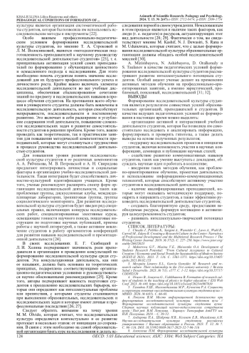 4. Orazov B., Issayeva G., Ualikhanova B. Formation of research culture of students in the teaching of physics in higher education // E3S Web Conf. 2023. № 449. DOI: 10.1051/e3sconf/202344907010 EDN: TYERWL