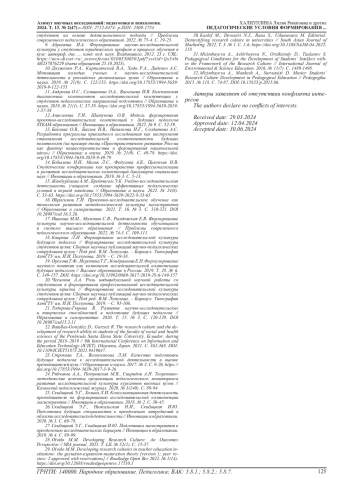 17. Иванова М.М., Малетин С.В., Рындовская Е.В. Формирование культуры научно-исследовательской деятельности обучающихся в системе высшего образования // Проблемы современного педагогического образования. 2022. № 74-3. С. 109-111. EDN: EEDZSK