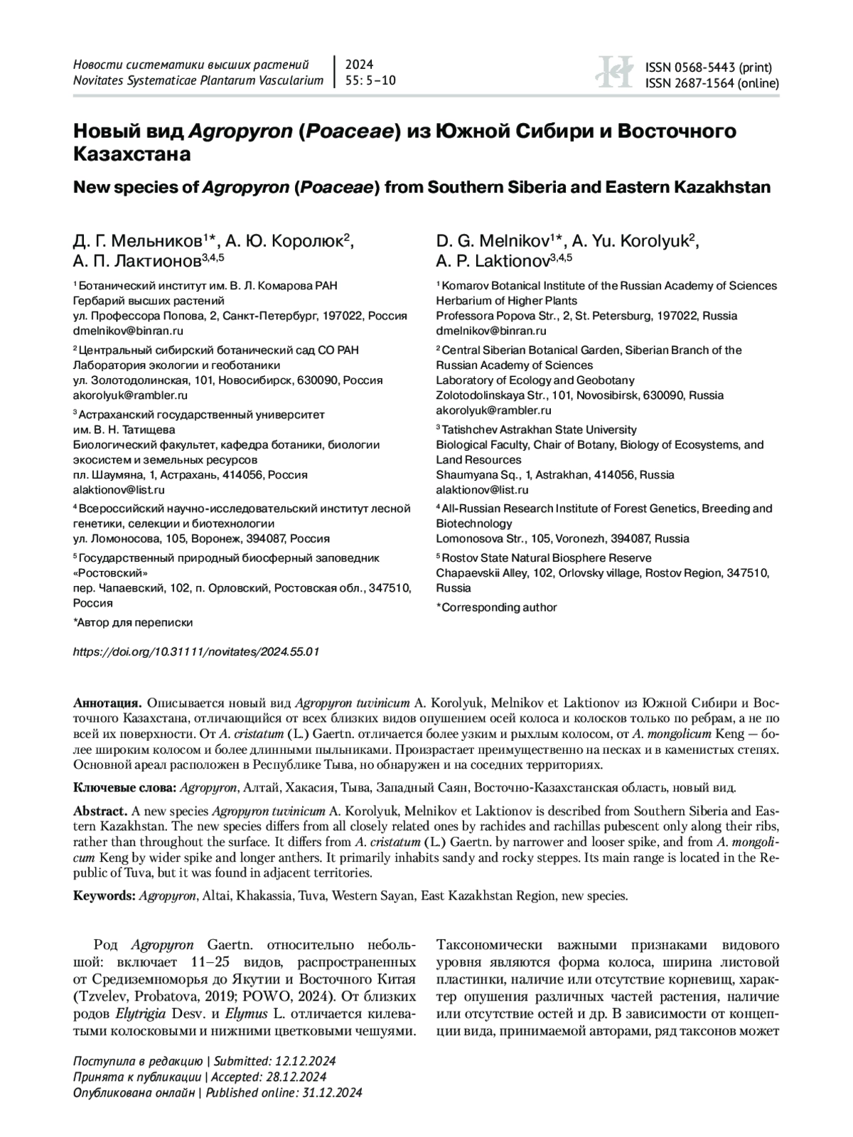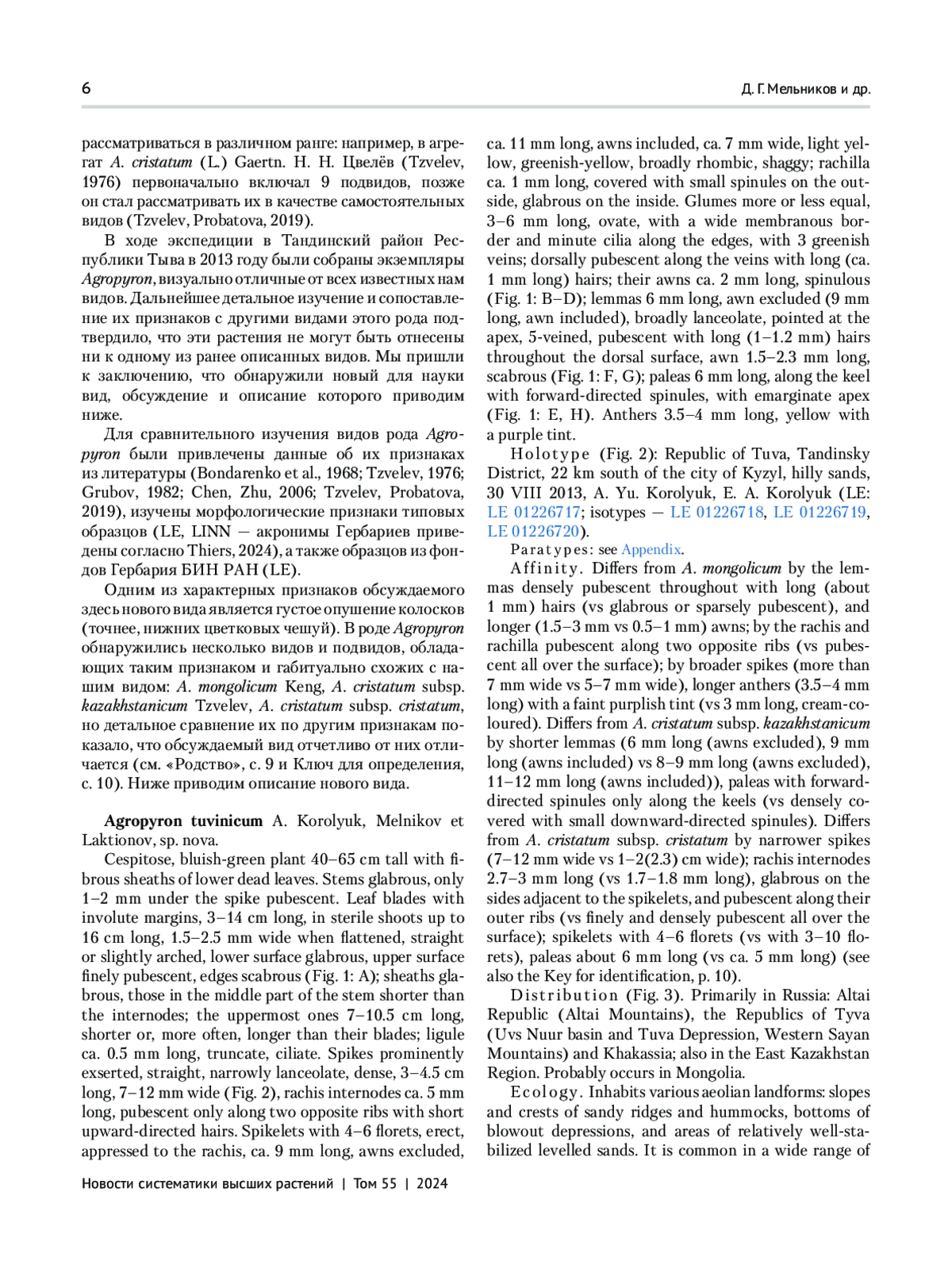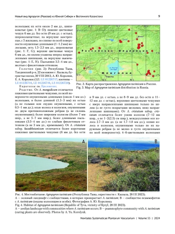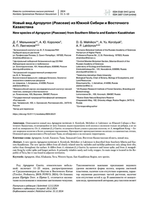 Описывается новый вид Agropyron tuvinicum A. Korolyuk, Melnikov et Laktionov из Южной Сибири и Восточного Казахстана, отличающийся от всех близких видов опушением осей колоса и колосков только по ребрам, а не по всей их поверхности. От A. cristatum (L.) Gaertn. отличается более узким и рыхлым колосом, от A. mongolicum Keng — более широким колосом и более длинными пыльниками. Произрастает преимущественно на песках и в каменистых степях. Основной ареал расположен в Республике Тыва, но обнаружен и на соседних территориях.