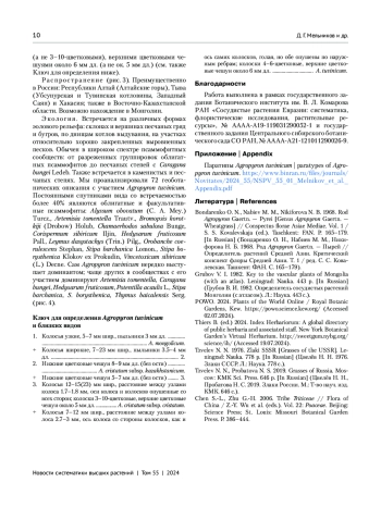 1. Bondarenko O. N., Nabiev M. M., Nikiforova N. B. 1968. Rod Agropyron Gaertn. - Pyrei [Genus Agropyron Gaertn. - Wheatgrass] // Conspectus florae Asiae Mediae. Vol. 1 / S. S. Kovalevskaja (ed.). Taschkent: FAN. P. 165-179.