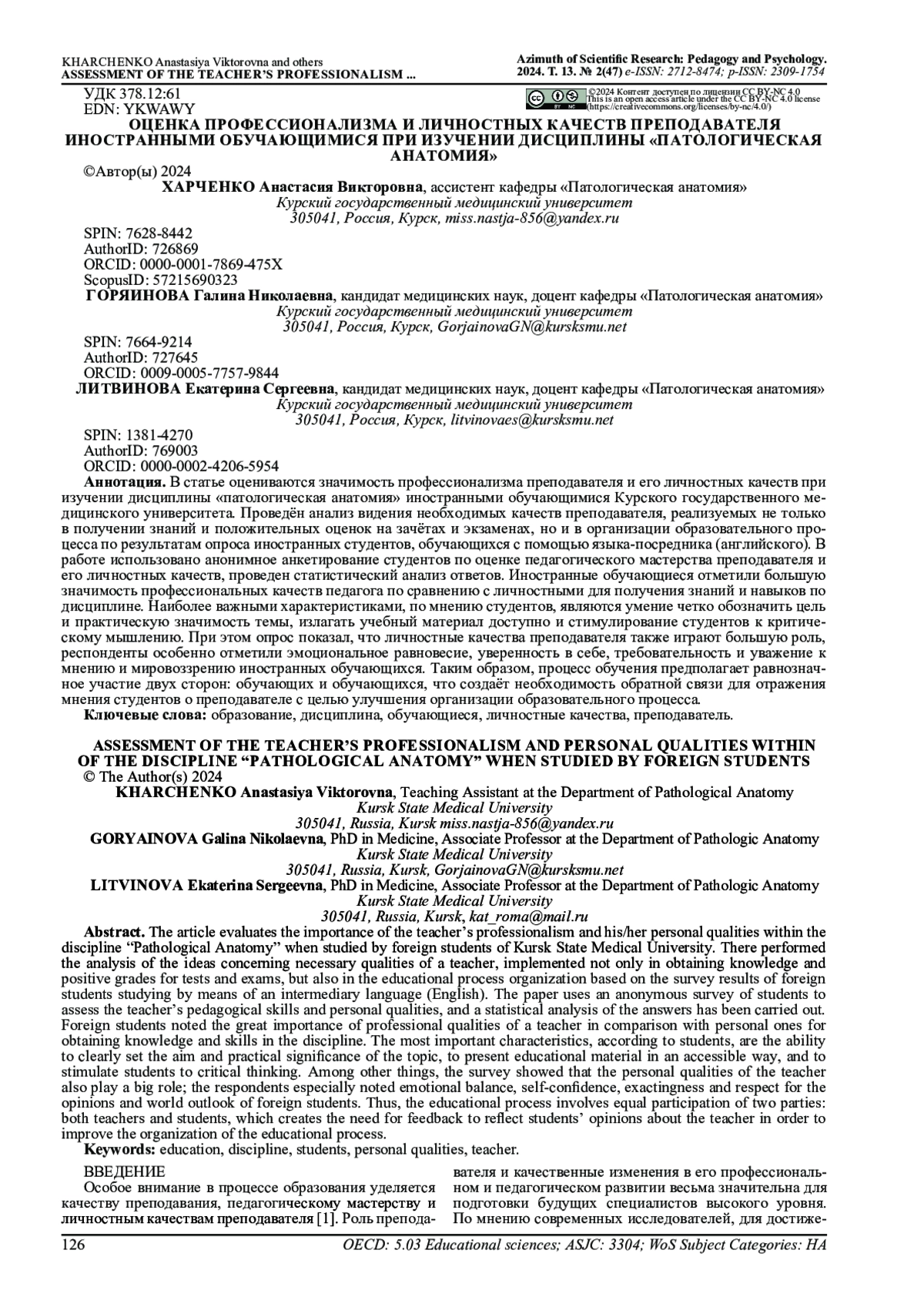 В статье оцениваются значимость профессионализма преподавателя и его личностных качеств при изучении дисциплины «патологическая анатомия» иностранными обучающимися Курского государственного медицинского университета. Проведён анализ видения необходимых качеств преподавателя, реализуемых не только в получении знаний и положительных оценок на зачётах и экзаменах, но и в организации образовательного процесса по результатам опроса иностранных студентов, обучающихся с помощью языка-посредника (английского). В работе использовано анонимное анкетирование студентов по оценке педагогического мастерства преподавателя и его личностных качеств, проведен статистический анализ ответов. Иностранные обучающиеся отметили большую значимость профессиональных качеств педагога по сравнению с личностными для получения знаний и навыков по дисциплине. Наиболее важными характеристиками, по мнению студентов, являются умение четко обозначить цель и практическую значимость темы, излагать учебный материал доступно и стимулирование студентов к критическому мышлению. При этом опрос показал, что личностные качества преподавателя также играют большую роль, респонденты особенно отметили эмоциональное равновесие, уверенность в себе, требовательность и уважение к мнению и мировоззрению иностранных обучающихся. Таким образом, процесс обучения предполагает равнозначное участие двух сторон: обучающих и обучающихся, что создаёт необходимость обратной связи для отражения мнения студентов о преподавателе с целью улучшения организации образовательного процесса.