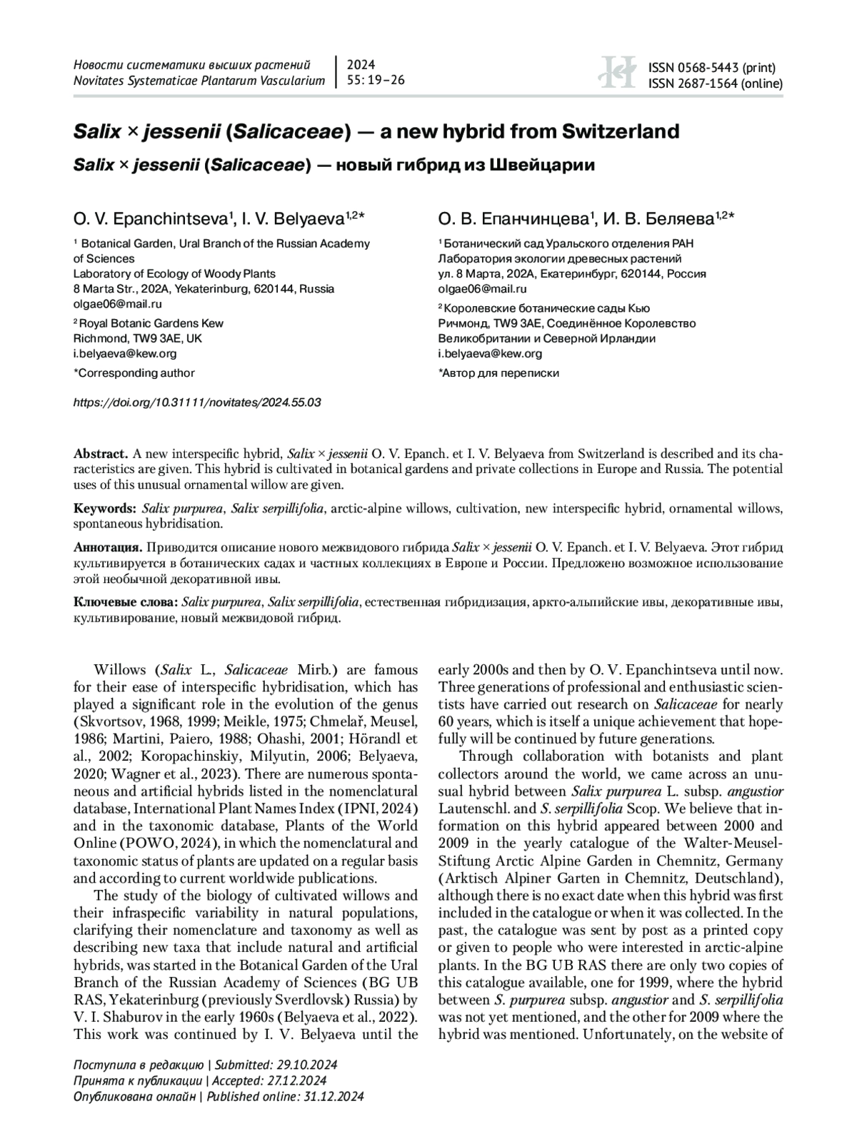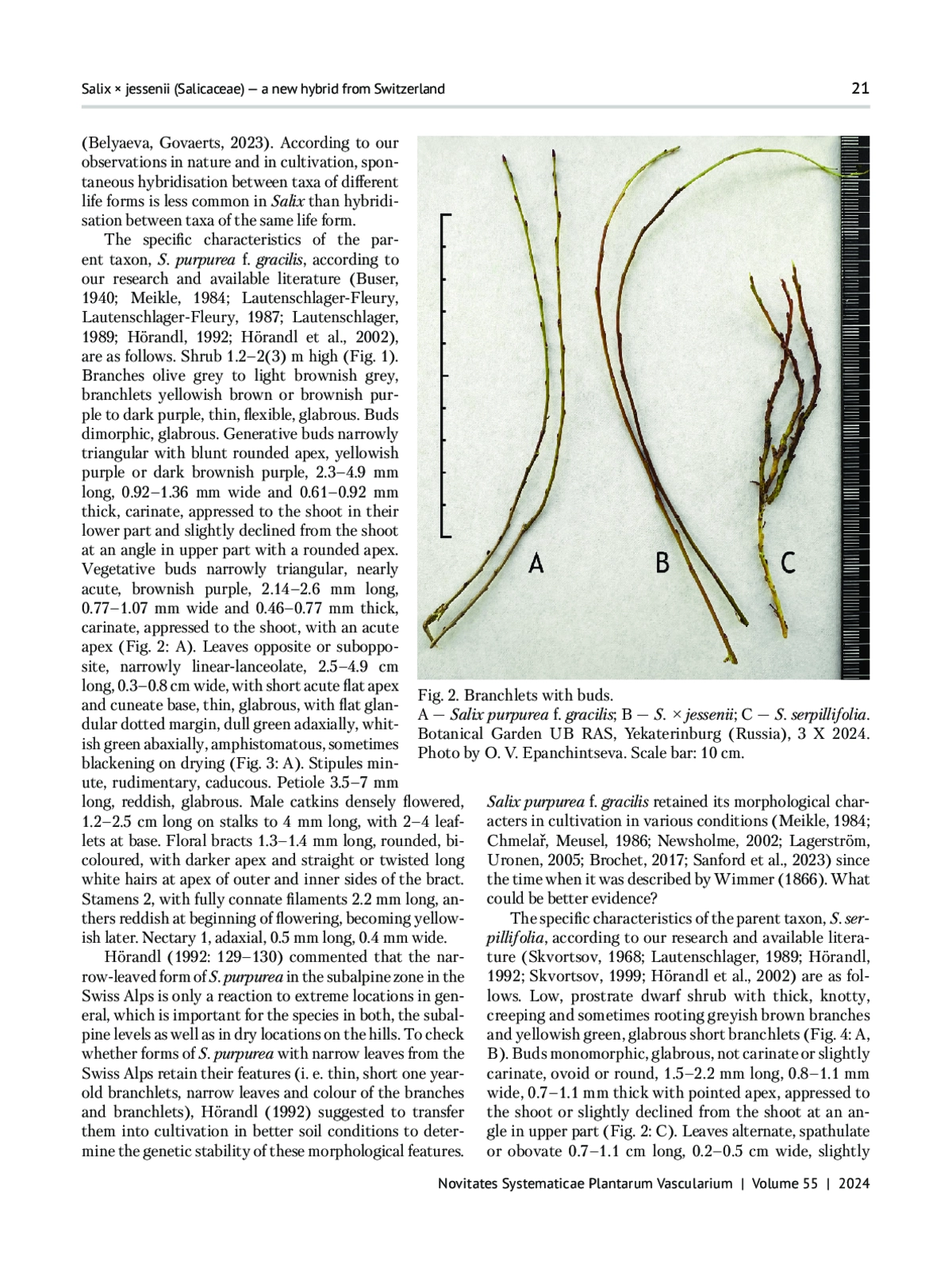 Willows (Salix L., Salicaceae Mirb.) are famous for their ease of interspecific hybridisation, which has played a significant role in the evolution of the genus (Skvortsov, 1968, 1999; Meikle, 1975; Chmelař, Meusel, 1986; Martini, Paiero, 1988; Ohashi, 2001; Hörandl et al., 2002; Koropachinskiy, Milyutin, 2006; Belyaeva, 2020; Wagner et al., 2023). There are numerous spontaneous and artificial hybrids listed in the nomenclatural database, International Plant Names Index (IPNI, 2024) and in the taxonomic database, Plants of the World Online (POWO, 2024), in which the nomenclatural and taxonomic status of plants are updated on a regular basis and according to current worldwide publications.