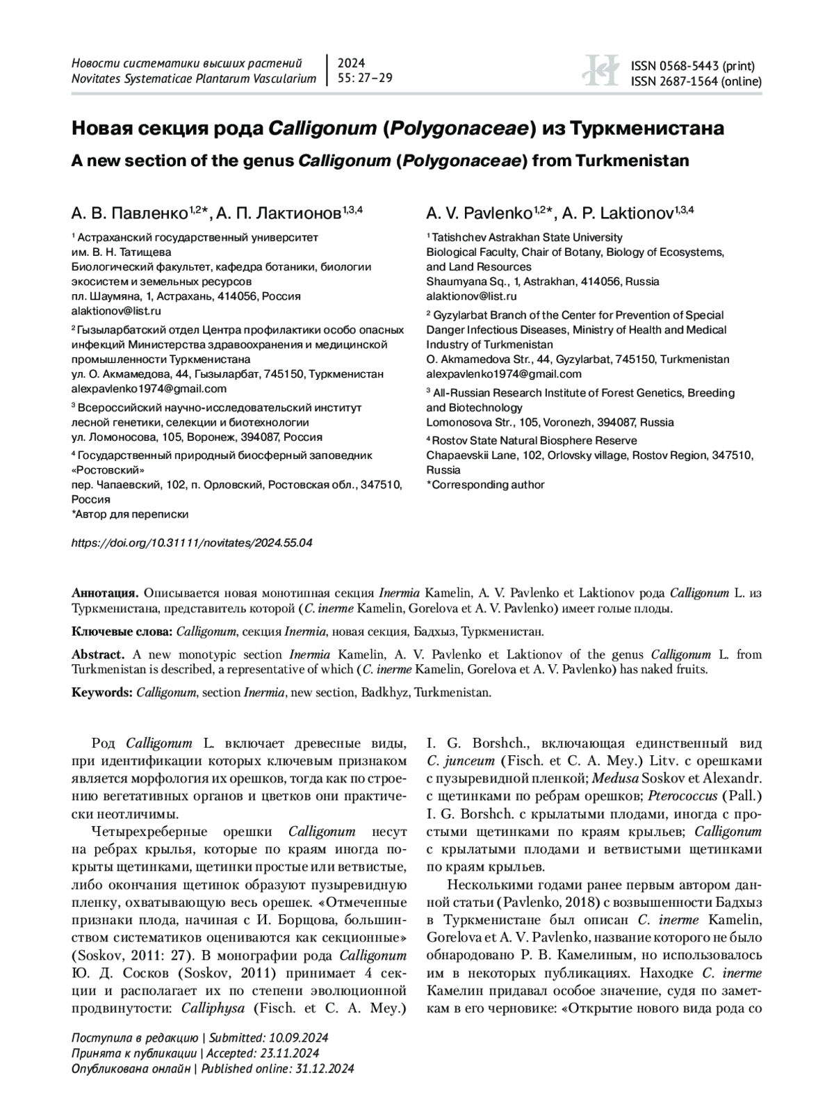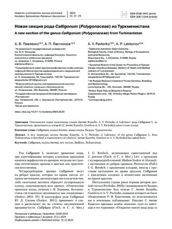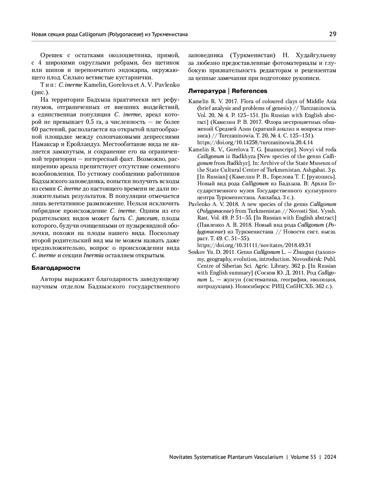 3. Pavlenko A. V. 2018. A new species of the genus Calligonum (Polygonaceae) from Turkmenistan // Novosti Sist. Vyssh. Rast. Vol. 49. P. 51-55. DOI: 10.31111/novitates/2018.49.51